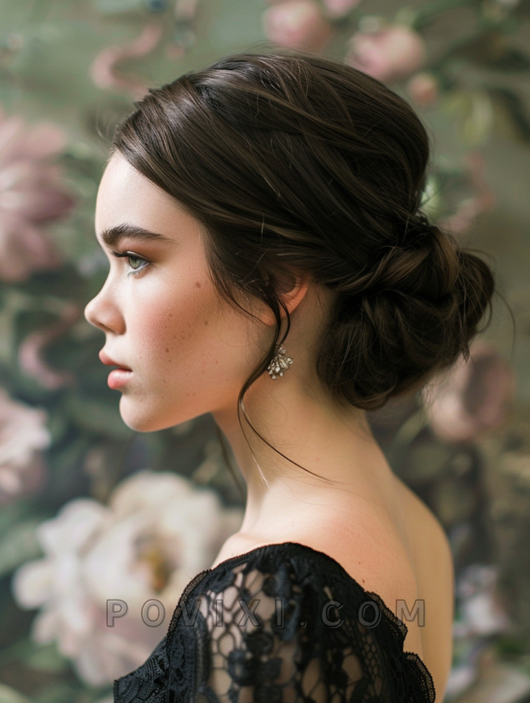 Sweep your hair to one side and loosely twist it into a low bun at the side of your head. Secure with pins and adorn with a simple, elegant accessory. A light mist of hairspray can help maintain the style’s elegance throughout the event.