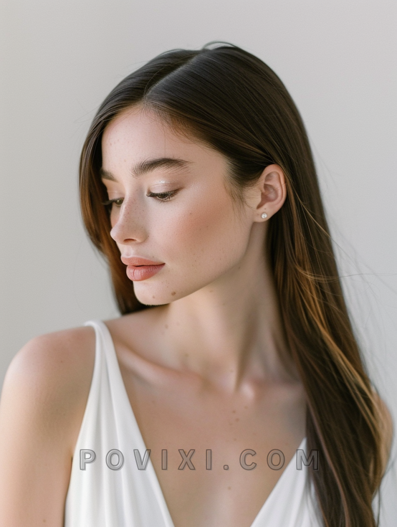 The Sleek and Straight with a Deep Side Part hairstyle is ideal for brides or guests with long hair who prefer a minimalist yet striking appearance. This style is particularly flattering for those with square or rectangular face shapes, offering a sleek, contemporary vibe suitable for formal indoor weddings.