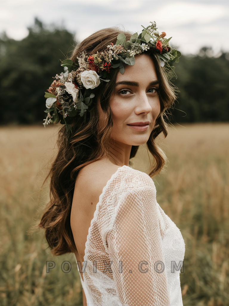 Boho Waves adorned with floral accents are the go-to for guests seeking a simple yet stylish look, especially suitable for those with long hair. This style fits well with casual or semi-formal wedding themes and is ideal for round or square face shapes, bringing attention to vibrant eye colors.