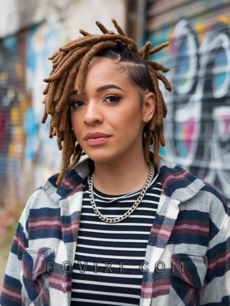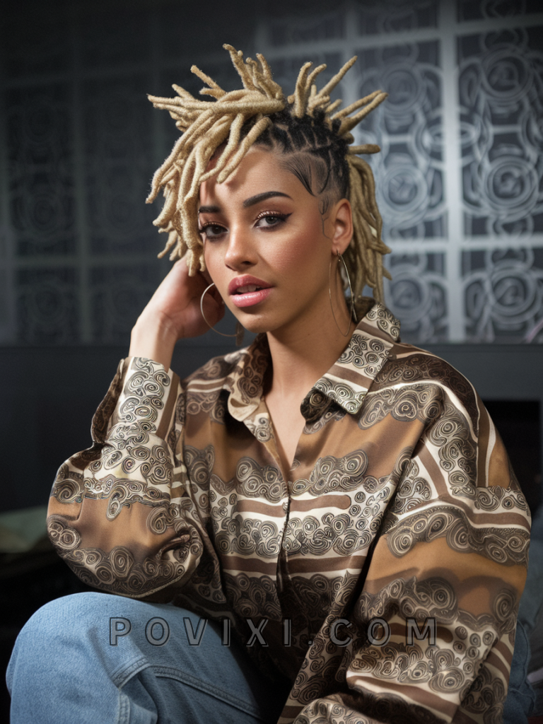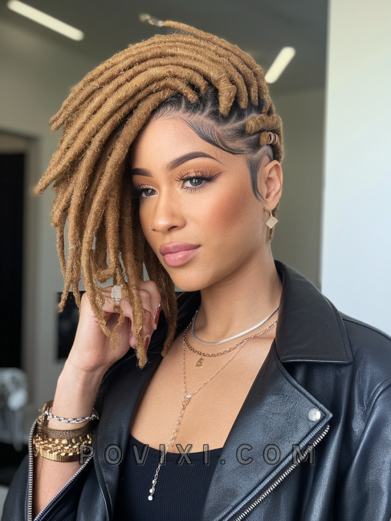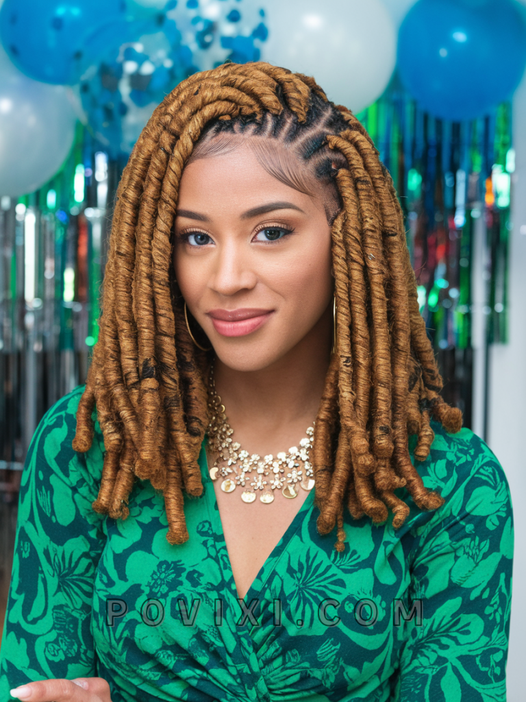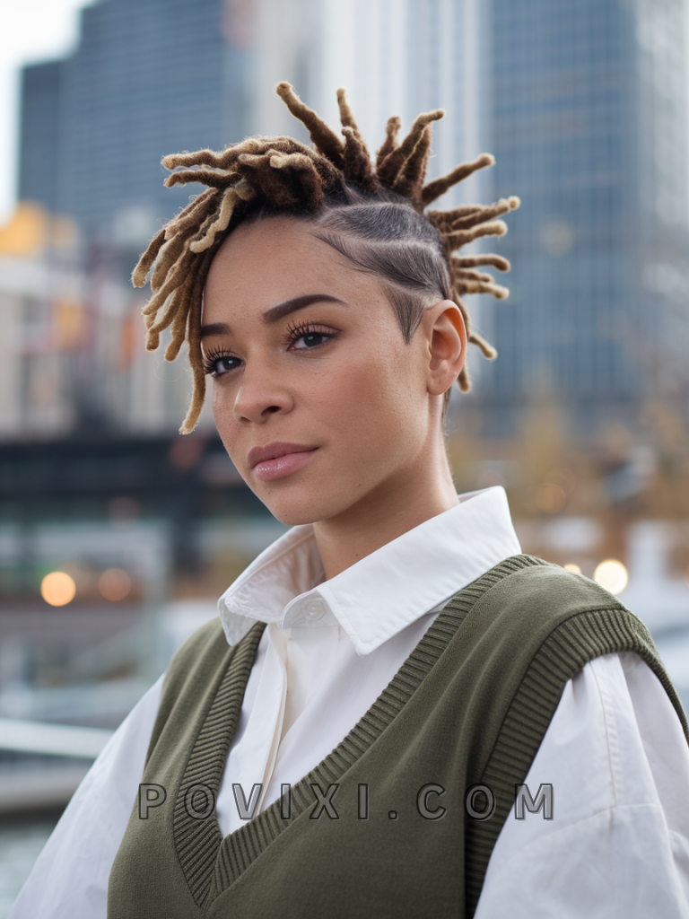 The faux hawk locs style creates a bold, edgy appearance that’s perfect for parties, creative events, or photoshoots.