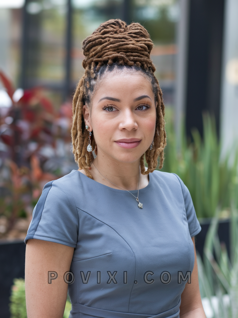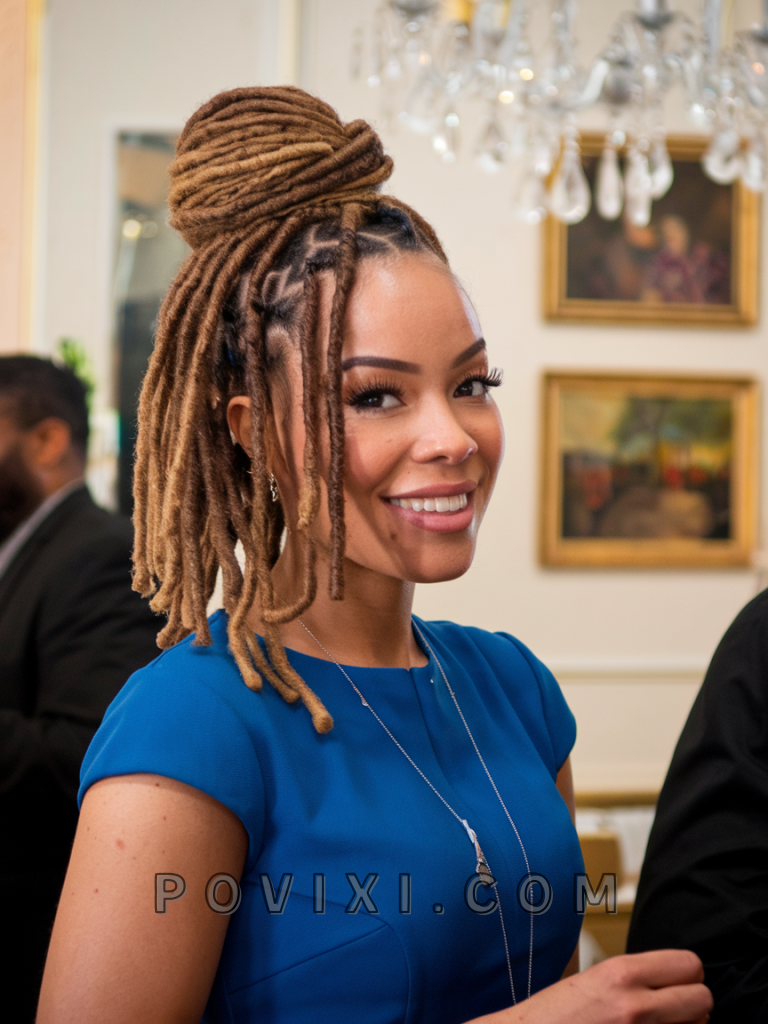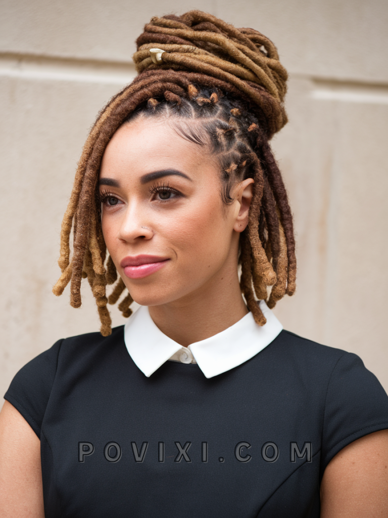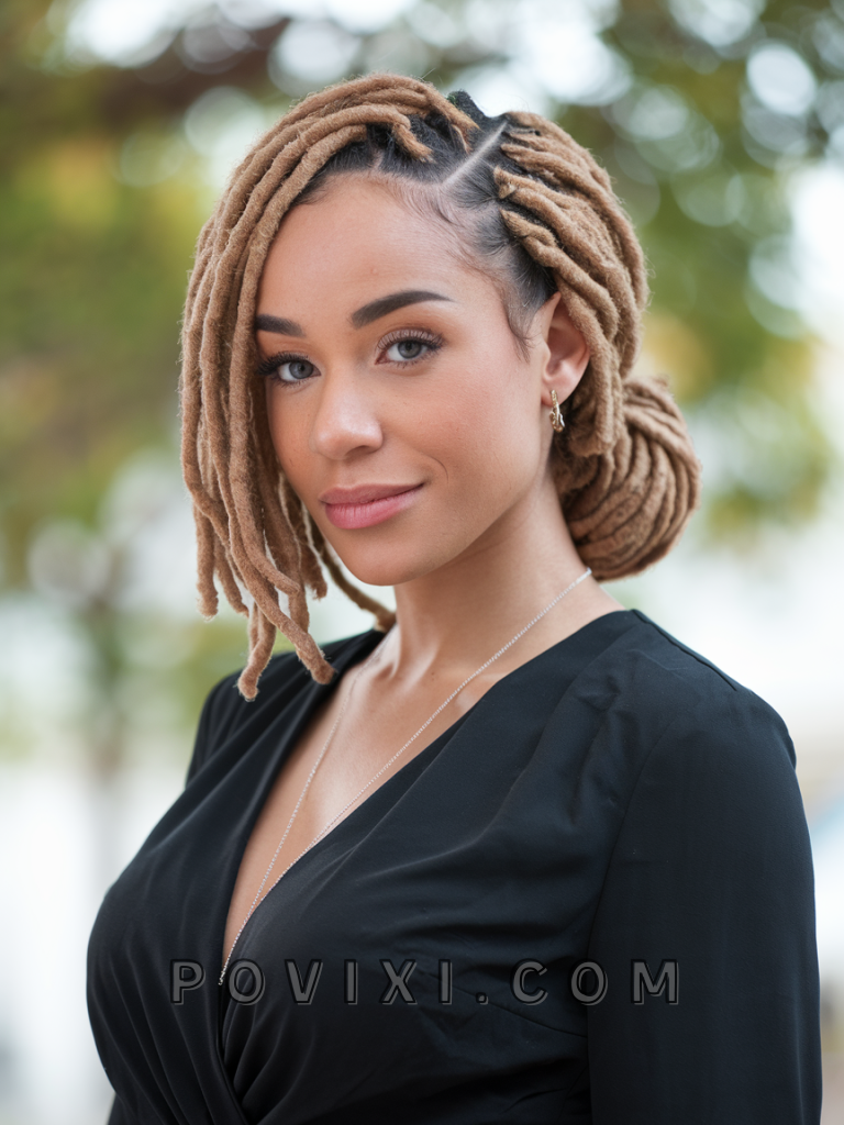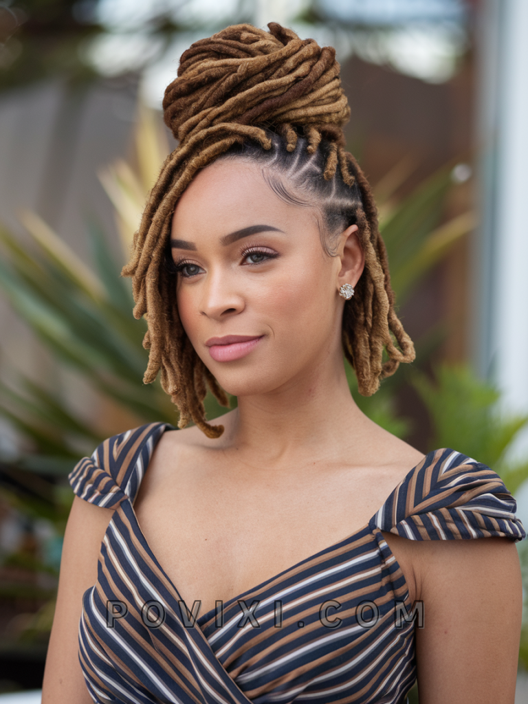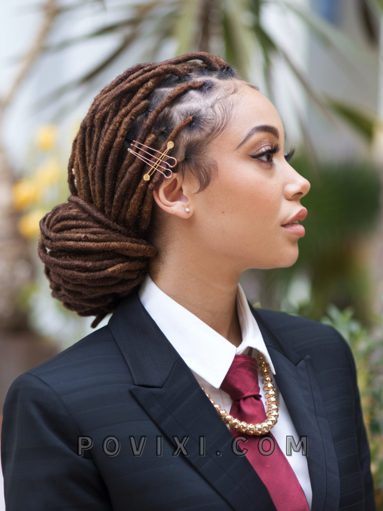 A women updo offers a timeless elegance suitable for formal events such as galas or weddings. This style involves sculpting your locs into a sleek bun or intricate twist, creating a sophisticated appearance. It suits heart-shaped faces and pairs beautifully with bold makeup and dark brown or black eyes.