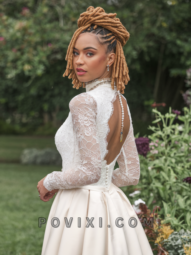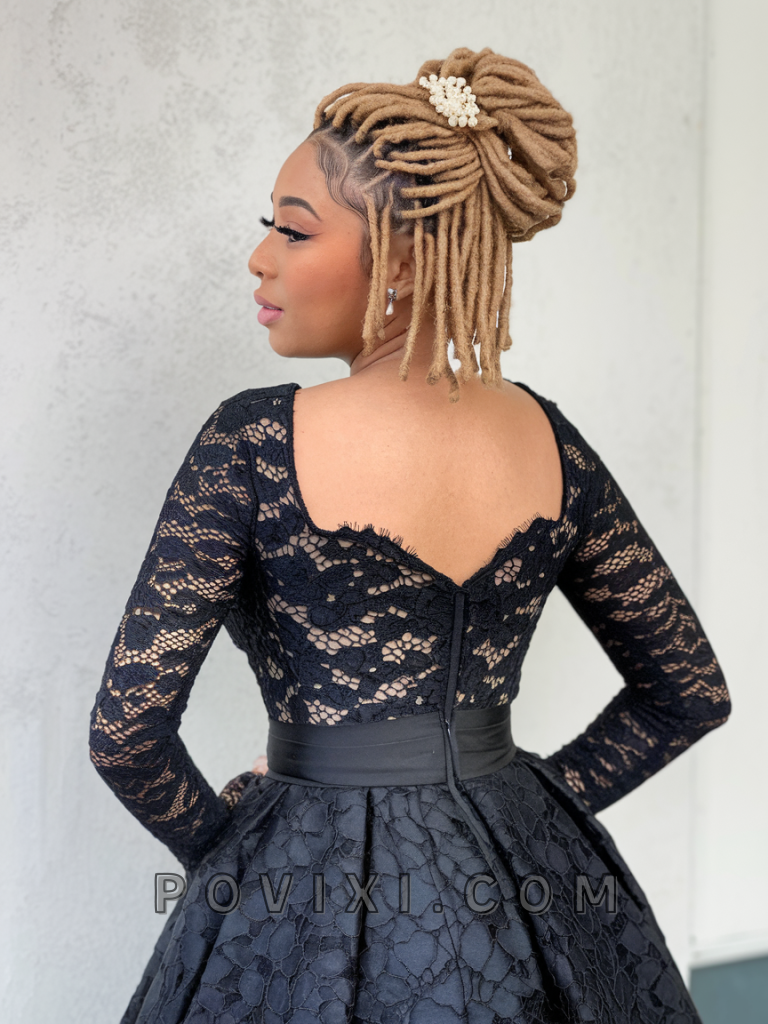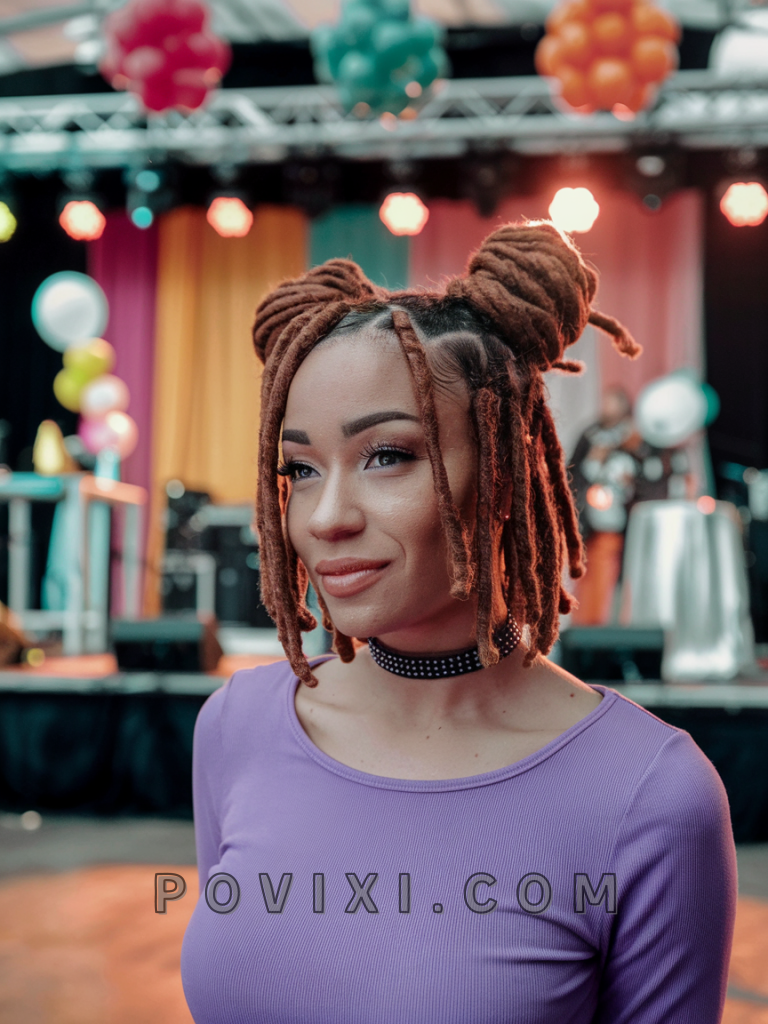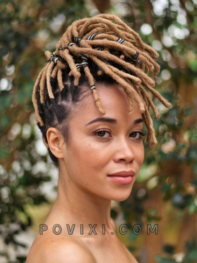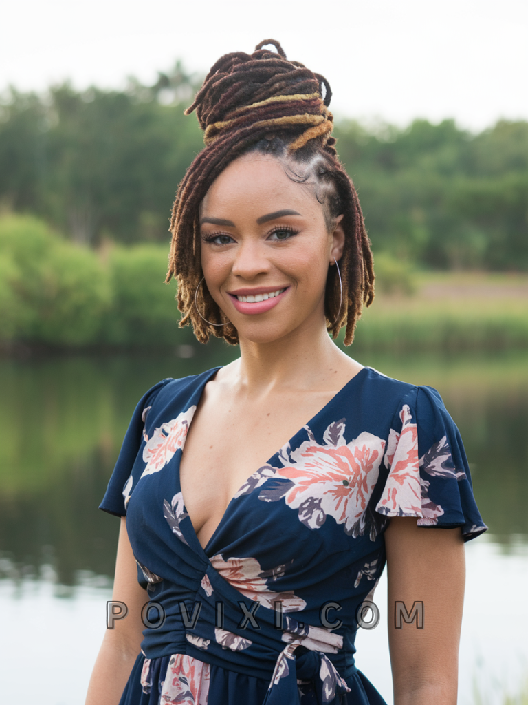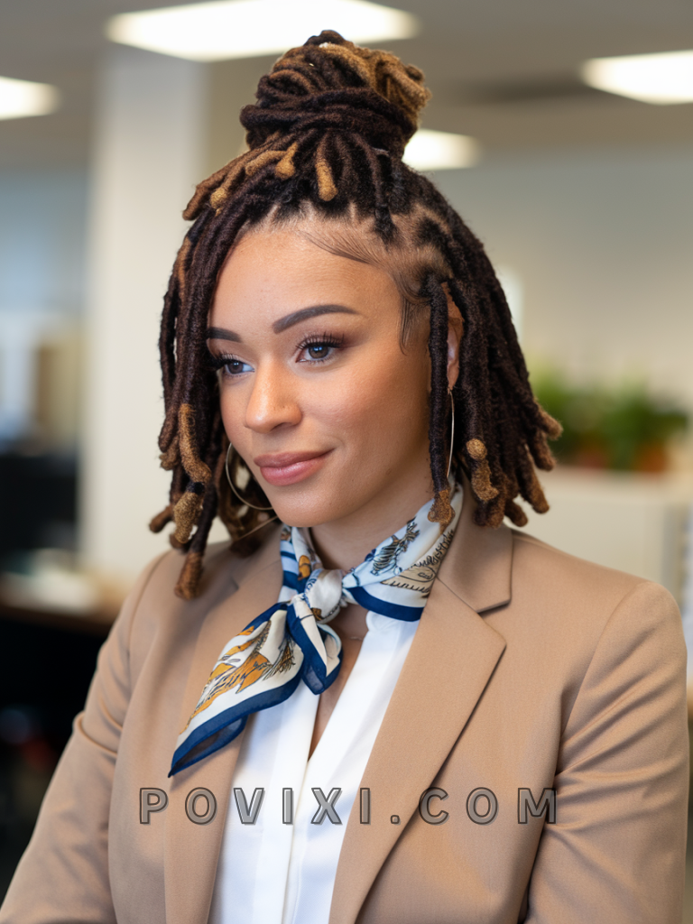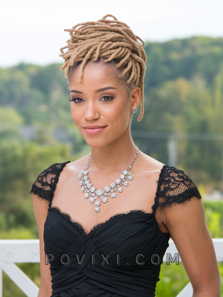 A women updo offers a timeless elegance suitable for formal events such as galas or weddings. This style involves sculpting your locs into a sleek bun or intricate twist, creating a sophisticated appearance. It suits heart-shaped faces and pairs beautifully with bold makeup and dark brown or black eyes.