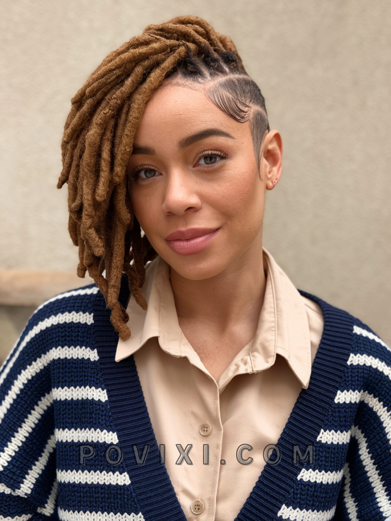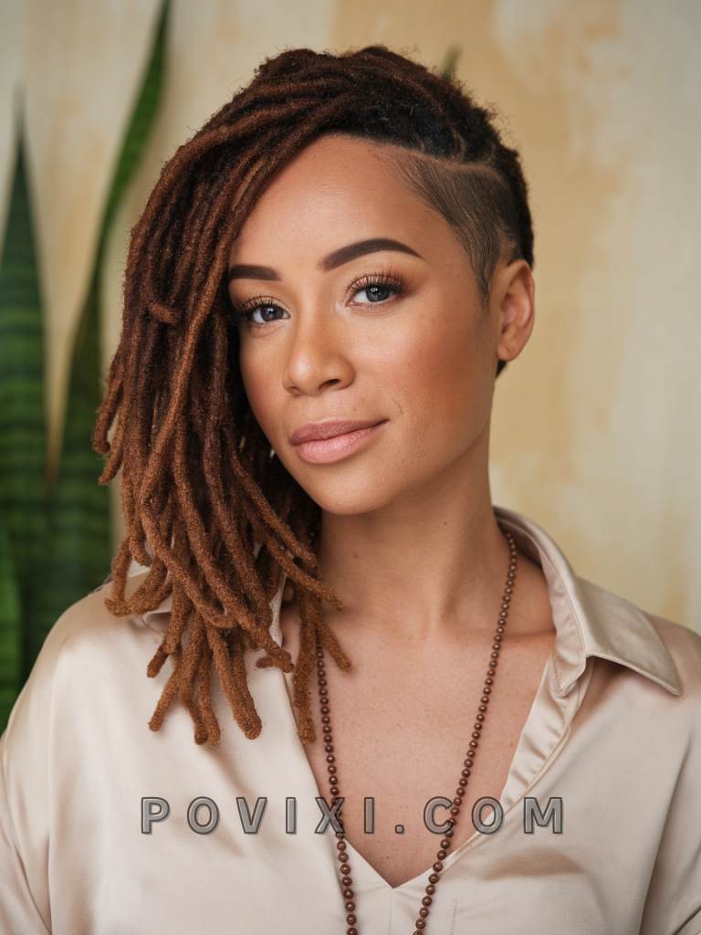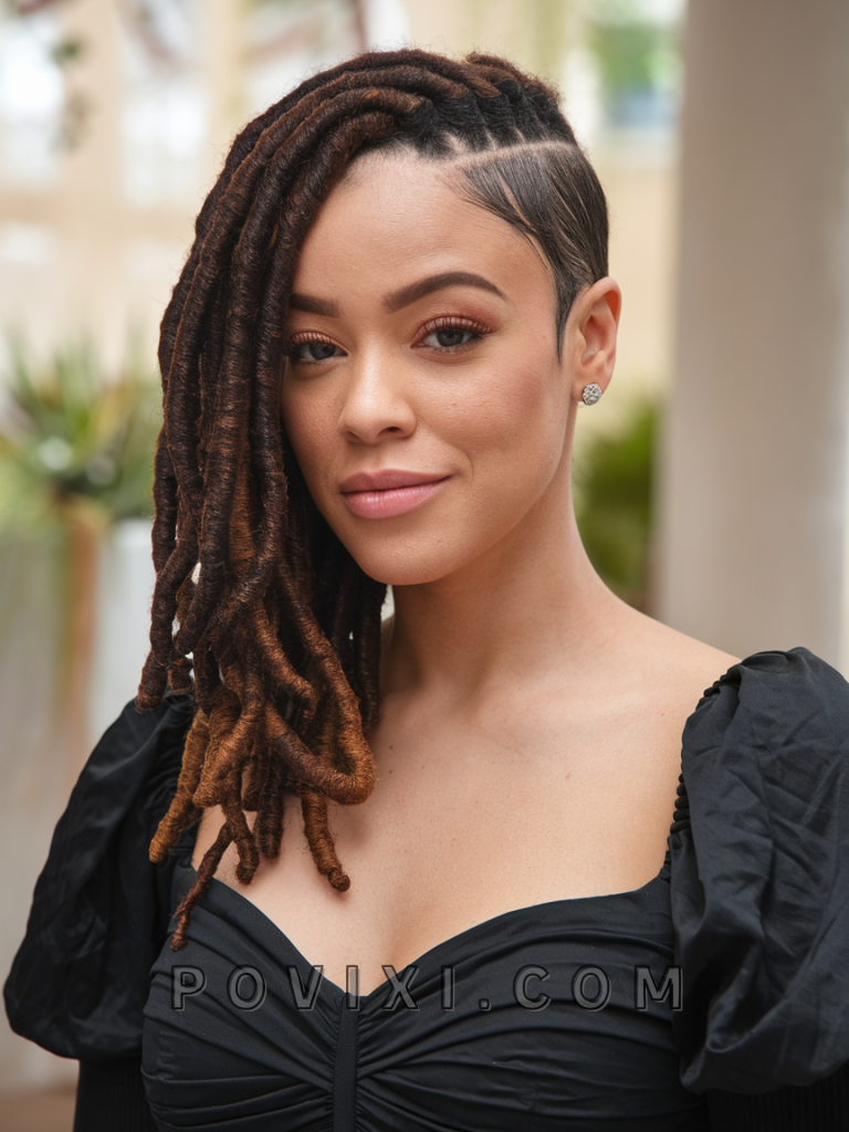 By parting your locs deeply to one side, you create a dramatic effect perfect for special occasions or nights out. This style complements round and oval faces and adds depth to dark brown or jet-black eyes.