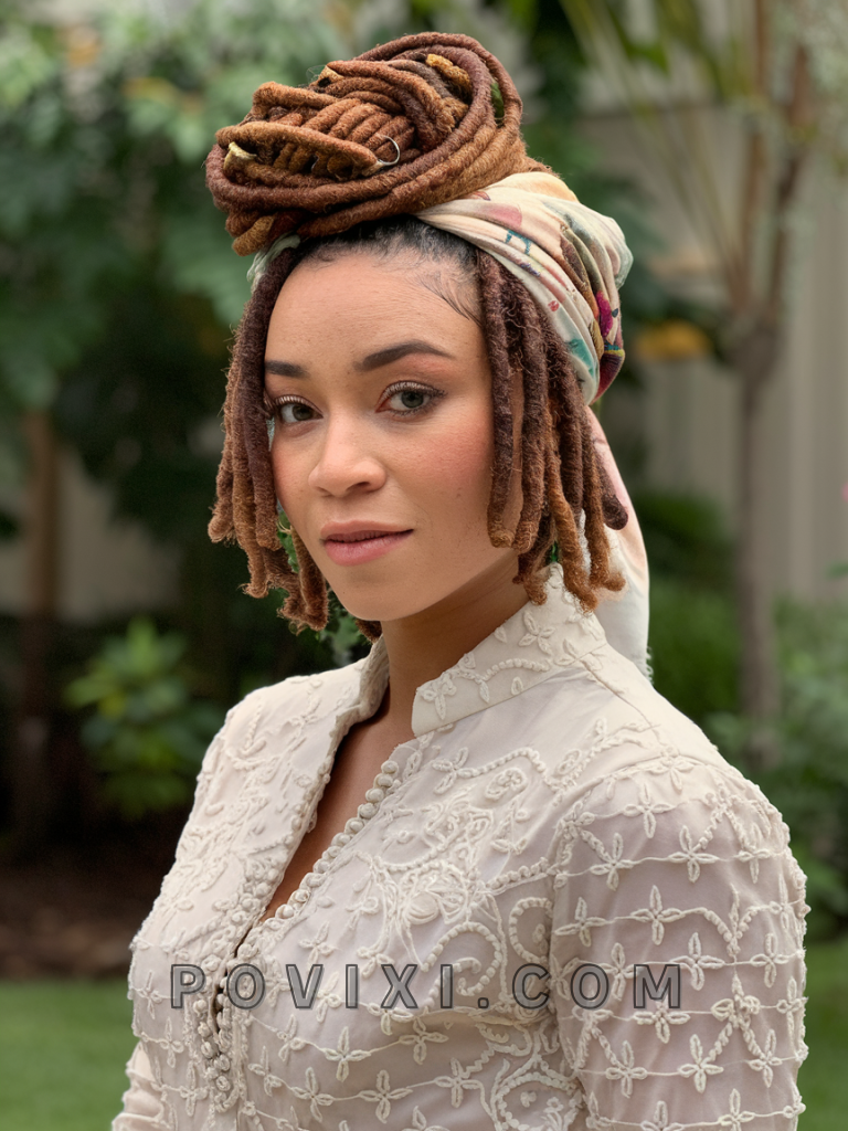 This style suits most face shapes and brings out the glow in dark brown or hazel eyes. It’s a simple yet glamorous way to style your locs for any occasion.