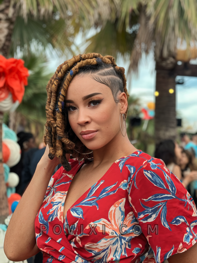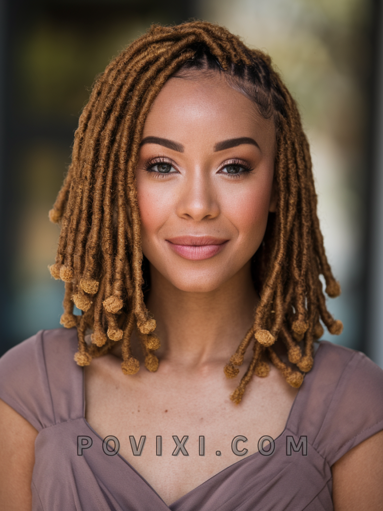 Braided locs adorned with beads offer a bohemian and artistic vibe. This style is perfect for festivals, cultural events, or vacations. It’s ideal for long oval faces and enhances the sparkle in brown or hazel eyes.