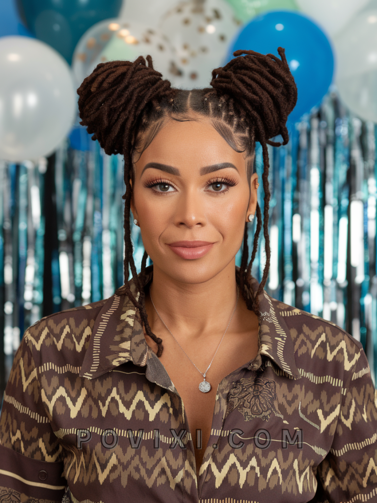 The twisted crown hairstyle creates a regal and sophisticated look by forming a crown-like structure with your locs. This style is ideal for weddings, formal dinners, or cultural celebrations. It’s perfect for oval and oblong face shapes and highlights warm brown or amber eyes beautifully.