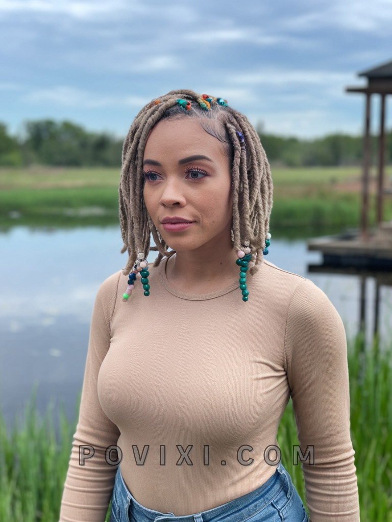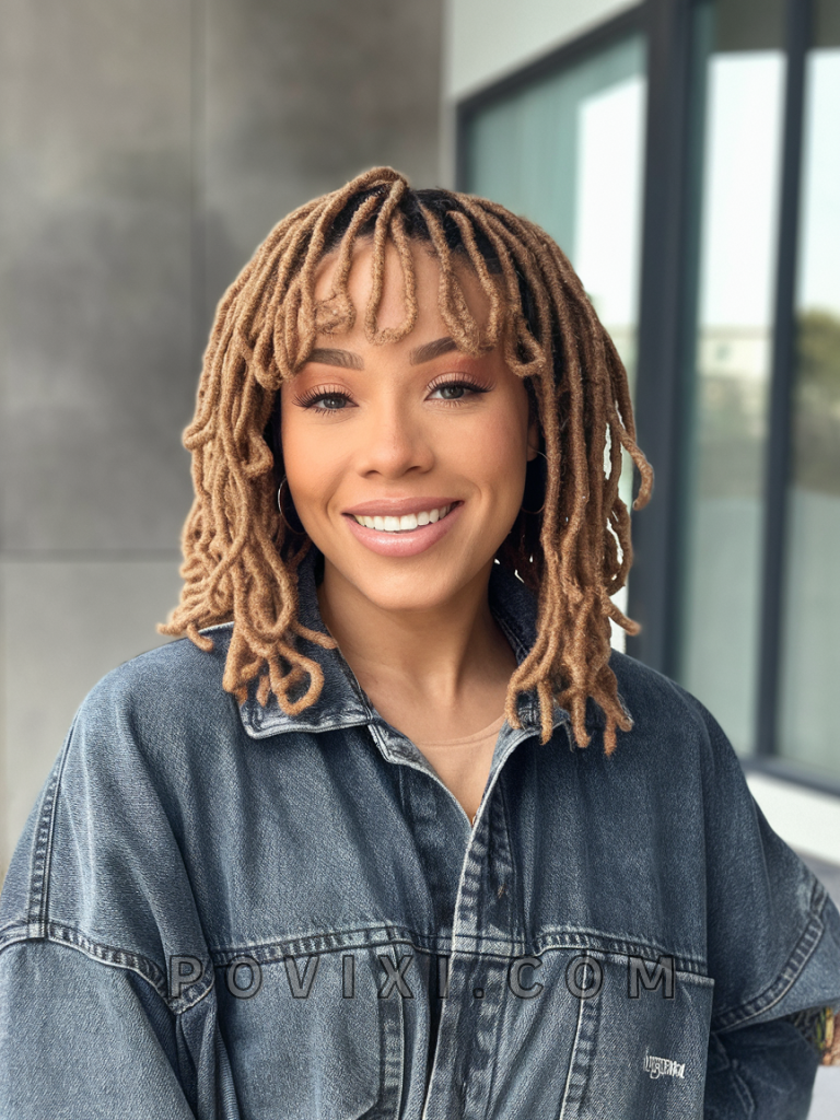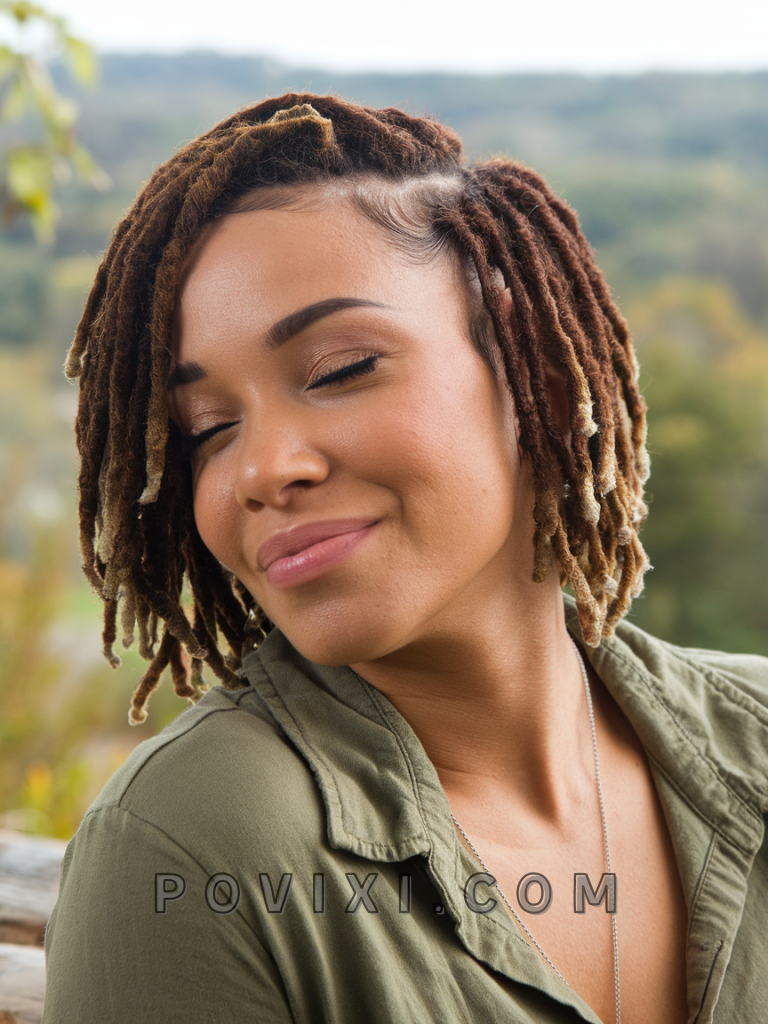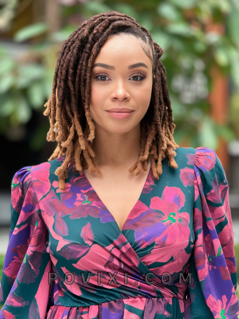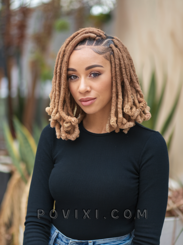 The bob locs with curls style offers a chic, modern look by combining a short bob cut with loose curls at the ends. This hairstyle is versatile enough for both professional settings and casual outings. It works best on square or round faces and emphasizes dark or light-colored eyes.