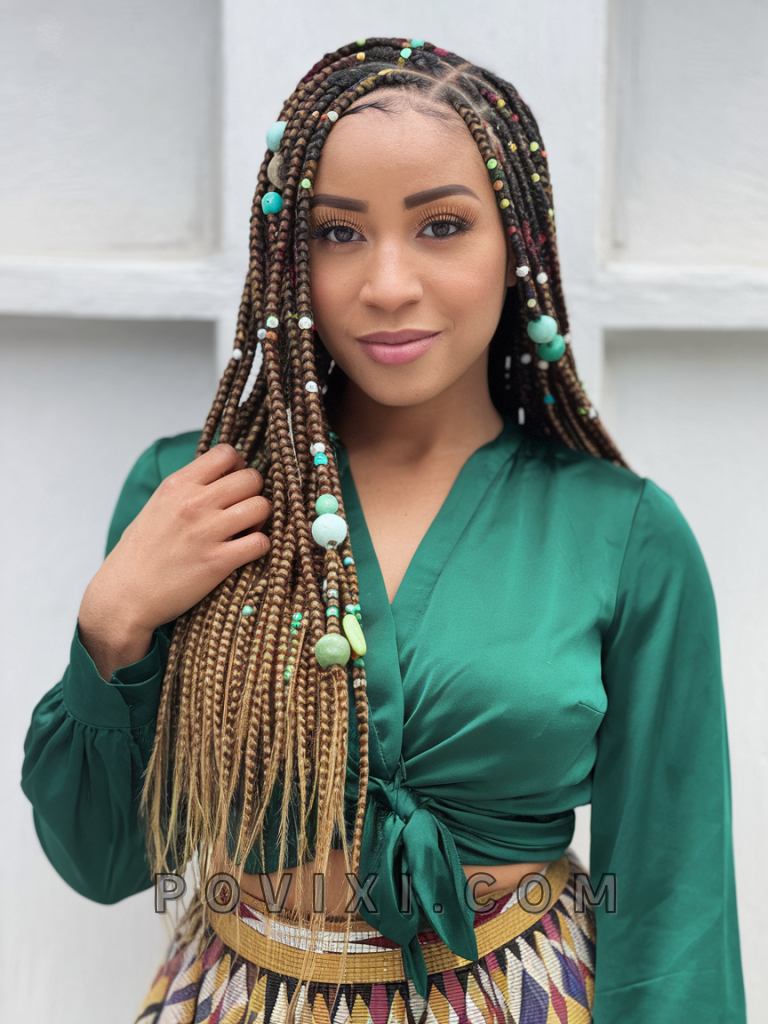The chin-length bob with braids and beads is a modern classic, combining a manageable length with the beauty of beads. This look is excellent for everyday wear, whether at work or at casual social gatherings. It suits round and oval faces well and accentuates dark eye colors like brown and black.