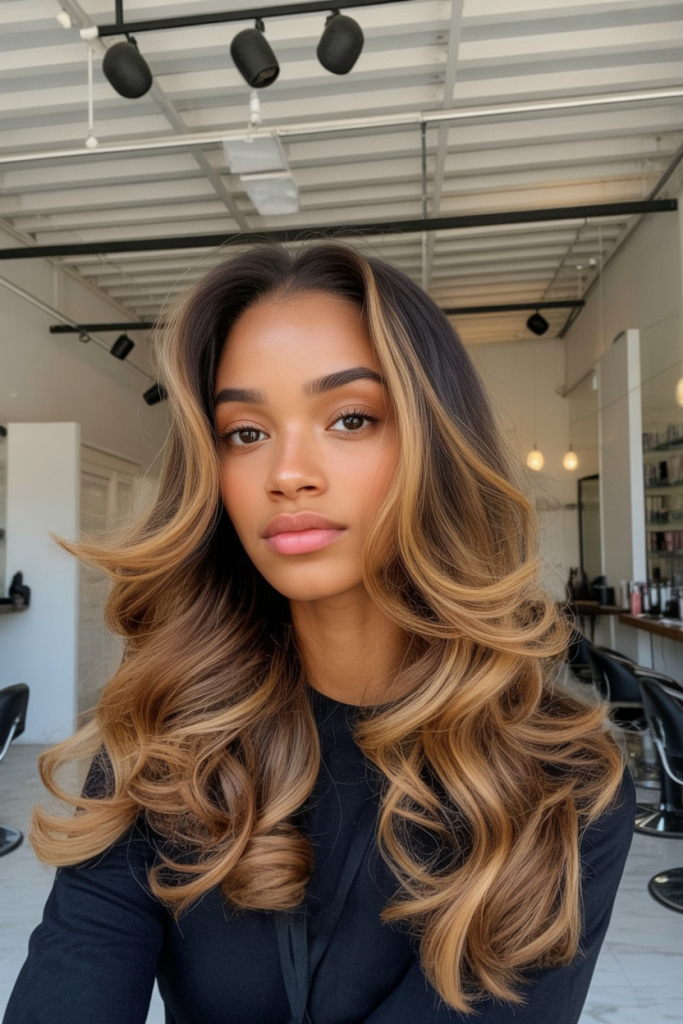 The combination of caramel honey medium tones flowing gently, in soft puffing waves is something undoubtedly glamorous about it. The stray curls are beautifully lit to give that effortless natural-looking inner light that makes you feel like you were just Victoria of the spring 2025 fashion editorial. It is delicate but fun and you feel extra confident when you see your reflection in the mirror.