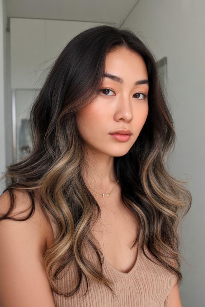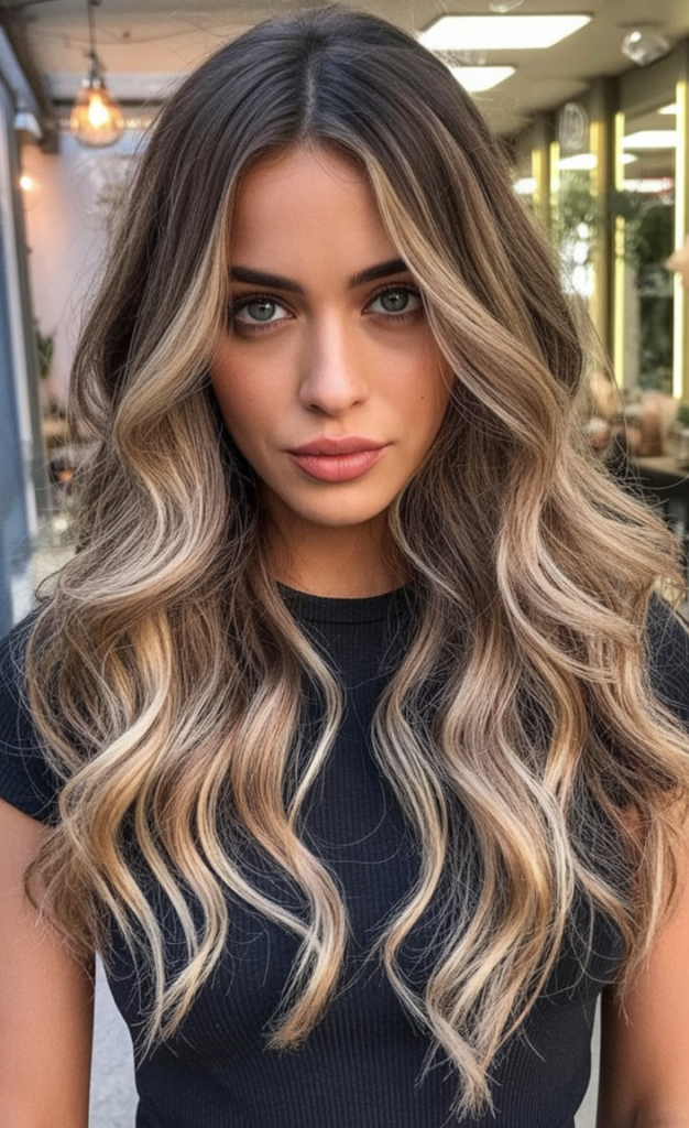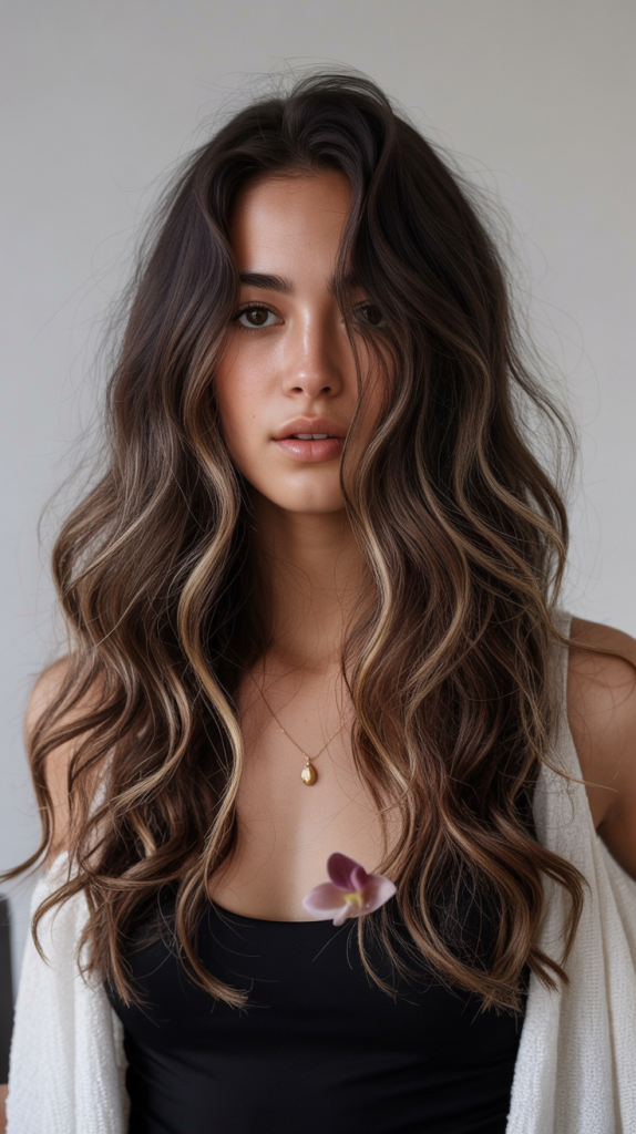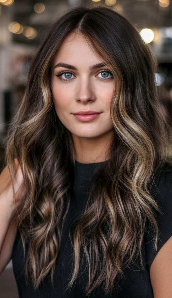 This style is deep and dramatic dark brown lengths that are kissed with lighter tones to help create the effect of dark blonde roots fading into the remainder of the hair. The placement of the balayage is useful in that it gives the face a soft overall frame and puts the light in all the appropriate places, but still, it has that lush deep-colored foundation.