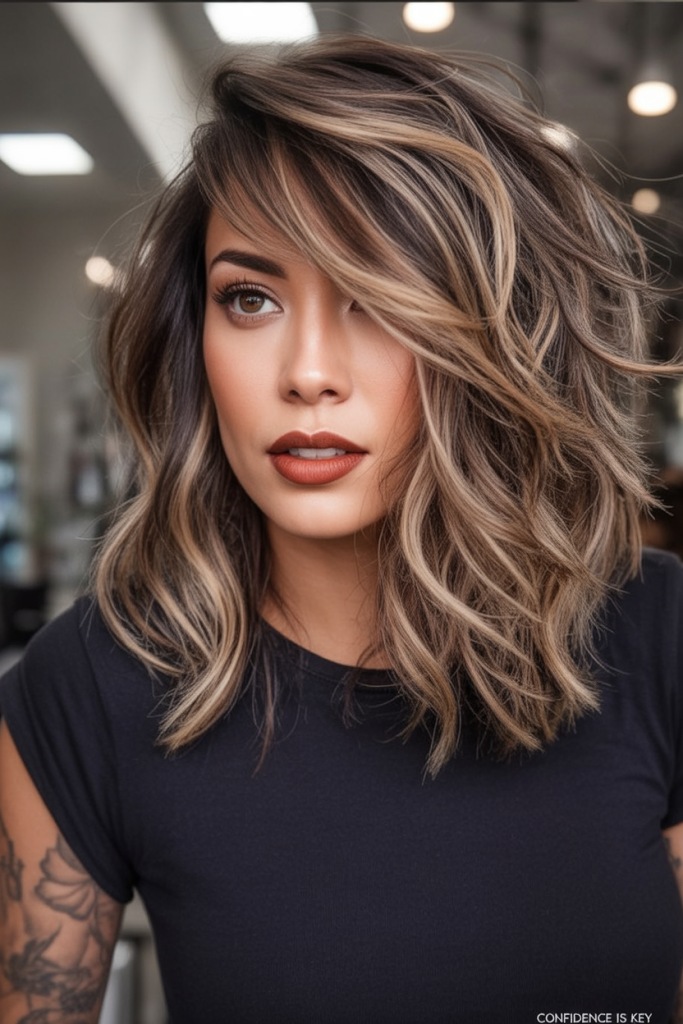 It is edgy but quintessentially stylish because the shoulder-length lob features lots of chunky blonde balayage ribbons on a deep espresso base. It has an undone, cool-girl texture and is appropriate to wear by the women who desire a stylish look with the least effort.