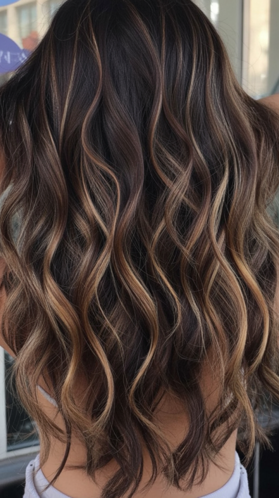 Glossy black espresso roots and an almost painterly pattern of ribbons of warm caramel are a good contrast to each other. This brunette balayage has the right proportion of rich and brightness that makes your hair look luxe, expensive but not overwhelming your natural color. It is that sort of a look which invites you with its texture and depth.