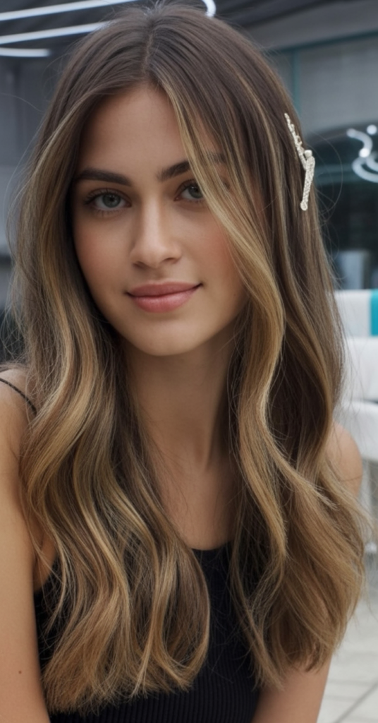 The style gives an immediate glow to the face with a dramatic blonde money piece to sit up to a rich brunette background. The waves are made to cascade down and form a luxurious outline with everything being focused on your eyes and cheekbones, and at the same time it stays exceptionally natural.