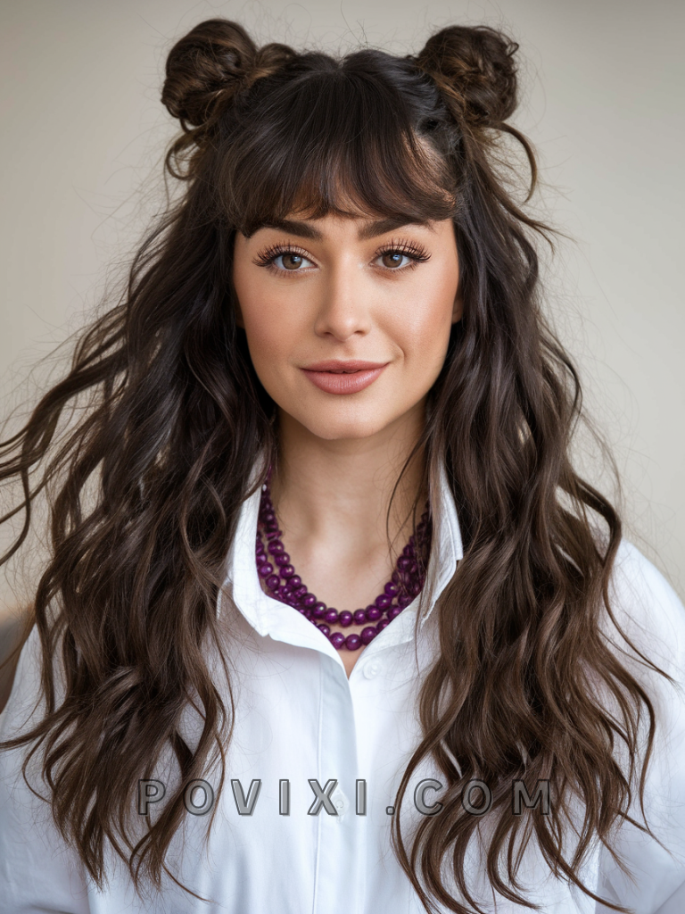 Curly Half-Up Space Buns with Fringe