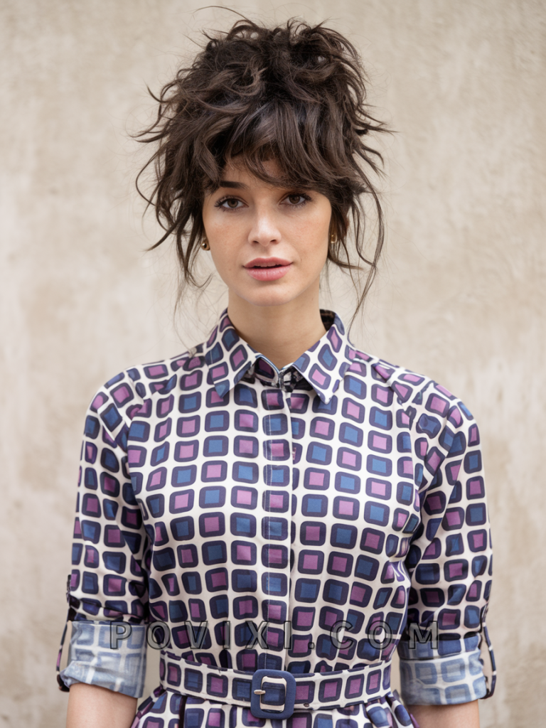 The curly bun with wispy bangs combines elegance and practicality, making it a great choice for wedding and prom events. The wispy bangs soften the look, making it suitable for round and oval faces. This style pairs beautifully with medium or dark eye colors, adding a romantic, delicate touch.