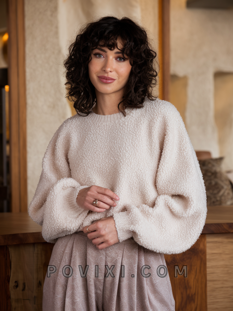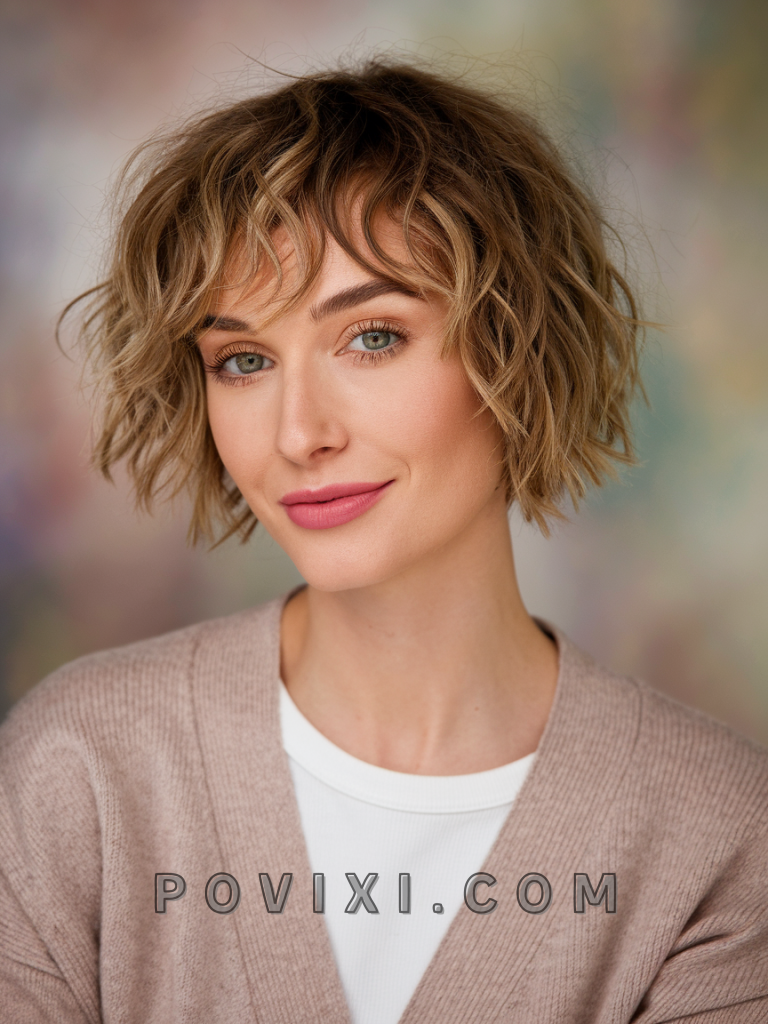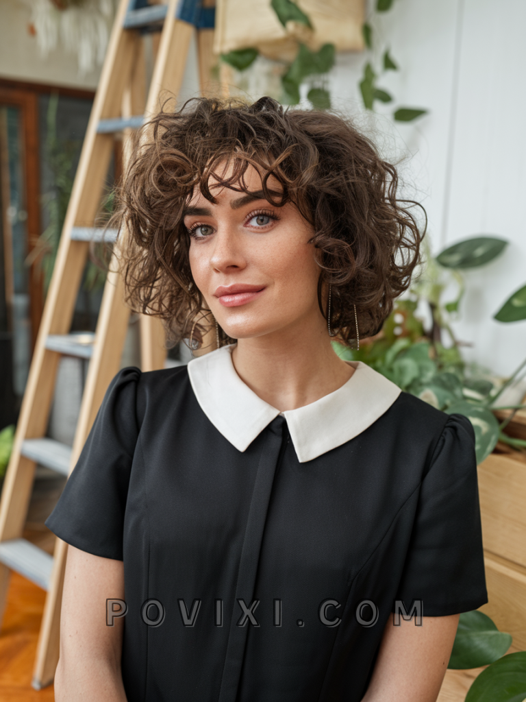 The short curly bob with choppy bangs brings a playful, retro vibe that is both simple and stylish. Ideal for those with short hair looking for an easy style, it suits square and oval faces, highlighting the jawline. This hairstyle works well for school or casual outings, complementing dark or warm eye colors.