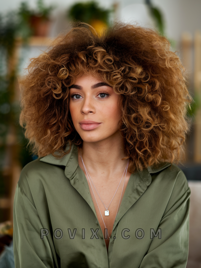 A voluminous Afro with curly bangs celebrates natural beauty, offering a bold baddie look. Perfect for black women with 3C or 4A textures, this style suits any face shape, especially oval and heart shapes, bringing attention to the entire face. Perfect for both formal and casual events, it’s an empowering choice that highlights natural texture beautifully, especially with vibrant eye colors.