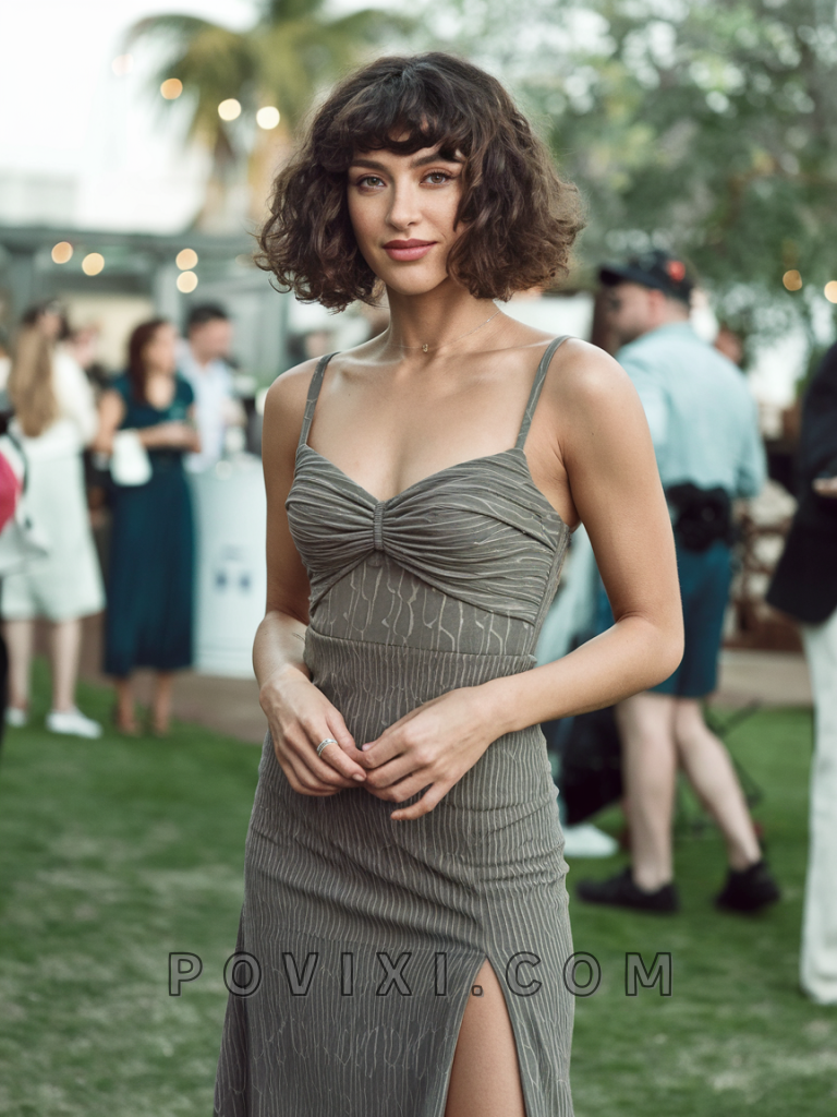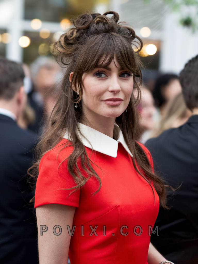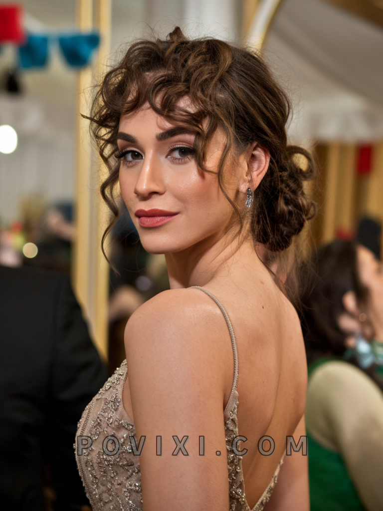 To create this style, loosely gather the curls into a bun and secure with a hair tie. Define the wispy bangs with a curling wand if needed, and apply a shine-enhancing serum like John Frieda Frizz Ease Extra Strength Serum. Use bobby pins to secure any loose strands and maintain the style throughout the event.