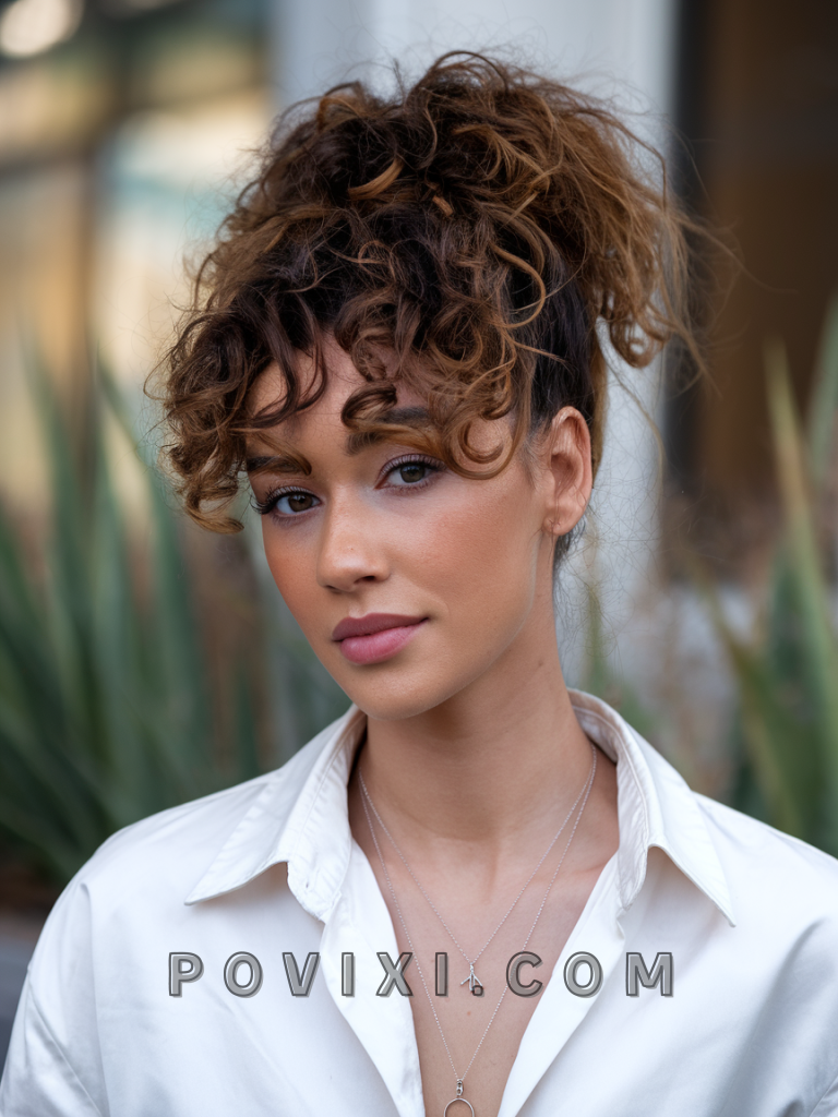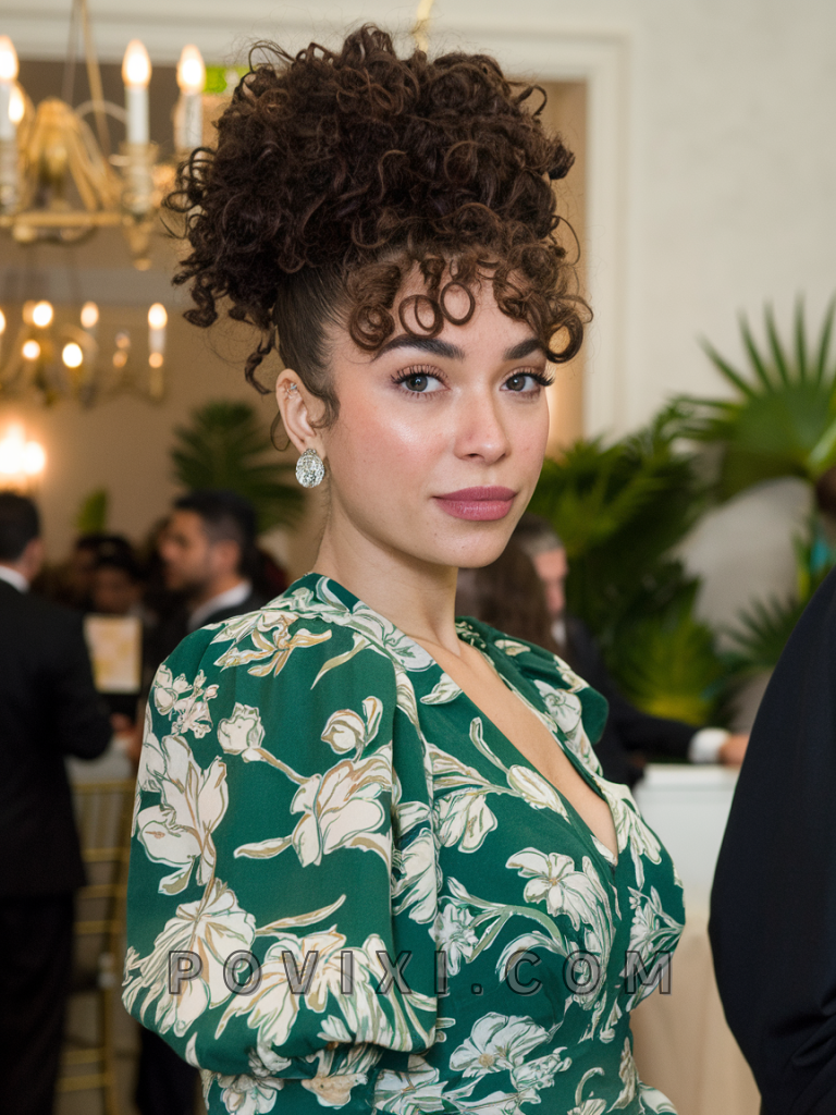A messy curly bun with wispy bangs is a simple yet stylish option, perfect for wedding or formal gatherings. This style flatters all face shapes, but it’s particularly appealing on heart and oval faces. The wispy bangs create a soft frame around the face, making it an ideal look for those with medium to long curls. The messy bun brings an effortless elegance, suiting both light and dark eye colors.