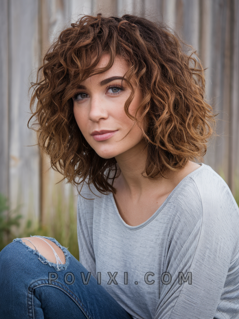 A curly shag with wispy bangs exudes an effortlessly cool vibe, blending retro and modern. Perfect for a casual school look or a relaxed summer day out, this style adds volume at the top with cascading curls for a free-spirited feel. Ideal for medium length hair, this cut suits round and oval faces particularly well, drawing attention to the eyes and cheekbones. It’s also a fantastic option for those with light-colored eyes, as the wispy bangs add softness that enhances facial features without overpowering them.