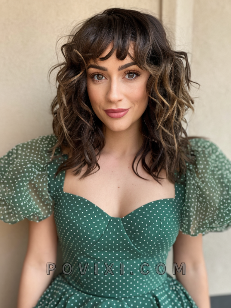 A mid-length curls with side-swept fringe is versatile and suitable for all occasions. Best for heart and oval faces, it creates a balanced frame, perfect for a formal event or summer gathering. This style is ideal for those who love soft, natural looks and suits various eye colors, adding a touch of mystery.