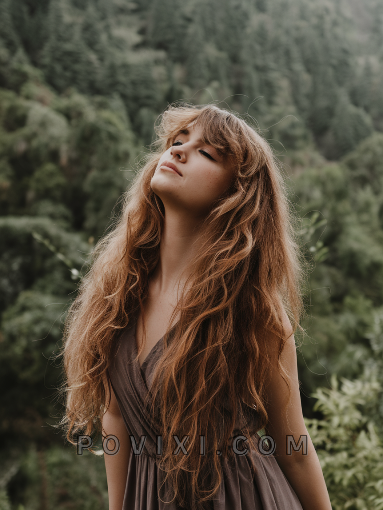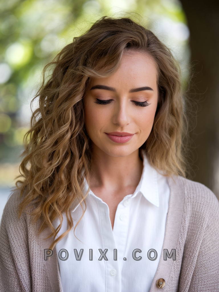 A sophisticated style, long curly hair with feathered bangs provides volume while adding softness around the face. Perfect for school or formal events, this style suits oval and oblong faces. It’s particularly flattering for those with medium to dark eye colors, adding dimension and depth to the face.