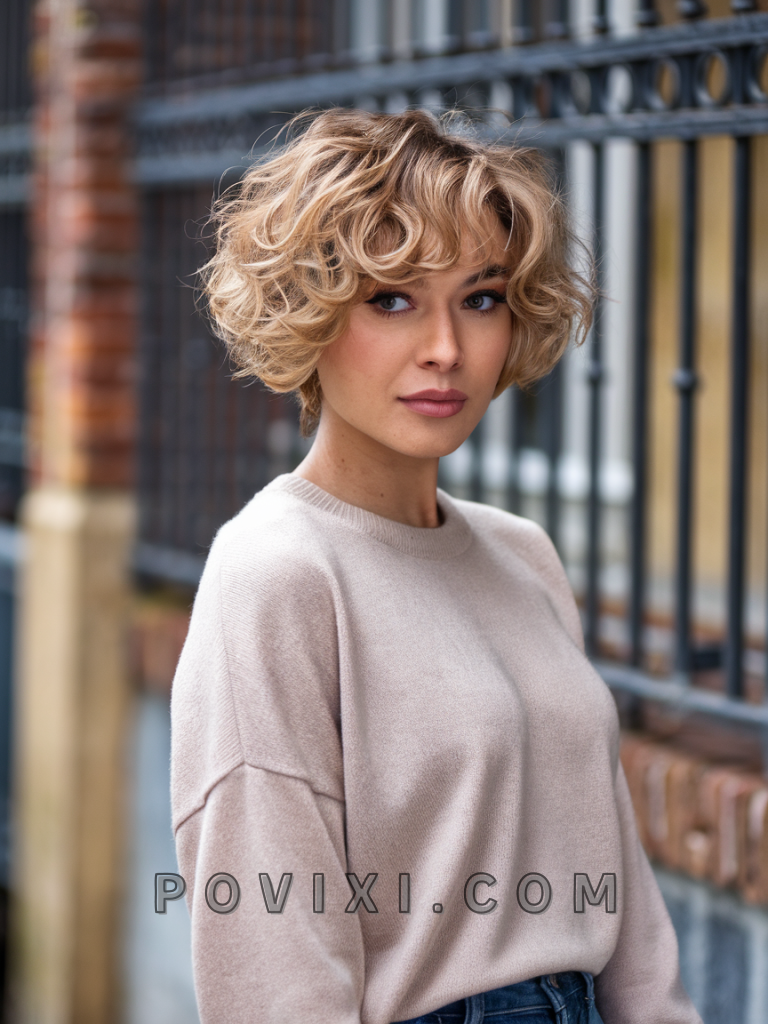 The short curly bob with choppy bangs brings a playful, retro vibe that is both simple and stylish. Ideal for those with short hair looking for an easy style, it suits square and oval faces, highlighting the jawline. This hairstyle works well for school or casual outings, complementing dark or warm eye colors.