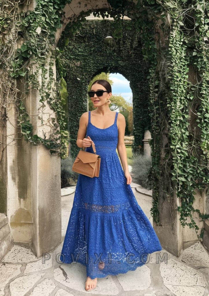 Embrace the charm of classic lace with a modern twist in this stunning royal blue maxi dress. The rich color speaks of depth and elegance, making it a perfect fit for both formal and classy settings. The dress’s lace overlay features intricate patterns that offer a visual feast, enhancing the garment’s exquisite craftsmanship. Accessories like a tan leather handbag and statement sunglasses can harmonize the ensemble, providing a polished yet striking look suitable for any sophisticated outdoor wedding.