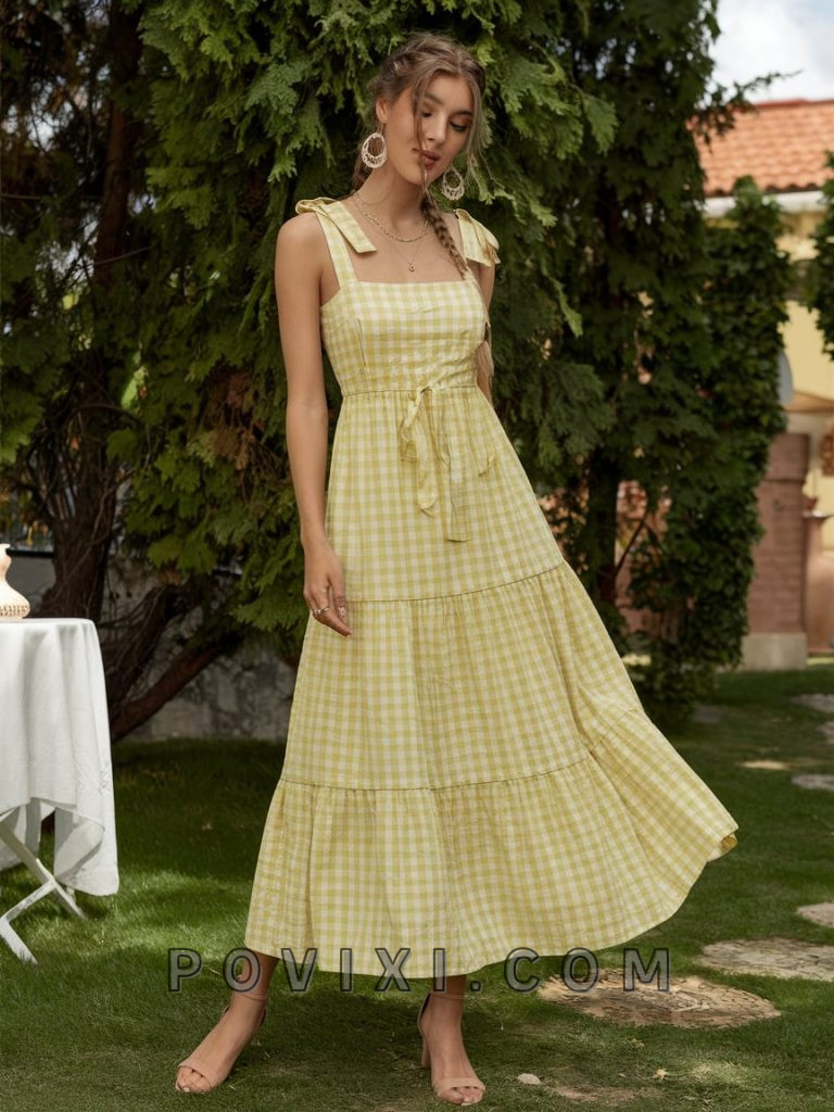 For a casual yet sophisticated outdoor wedding, this light and airy yellow gingham dress is a go-to. The fabric is breathable and perfect for hot summer days, while the tied shoulder straps add a touch of whimsy. The tiered skirt ensures movement and flow, making it ideal for dancing under the stars. Style with nude sandals and statement earrings for a fresh, youthful vibe. A soft, natural makeup look with sun-kissed bronzer will enhance the effortless charm of this outfit.