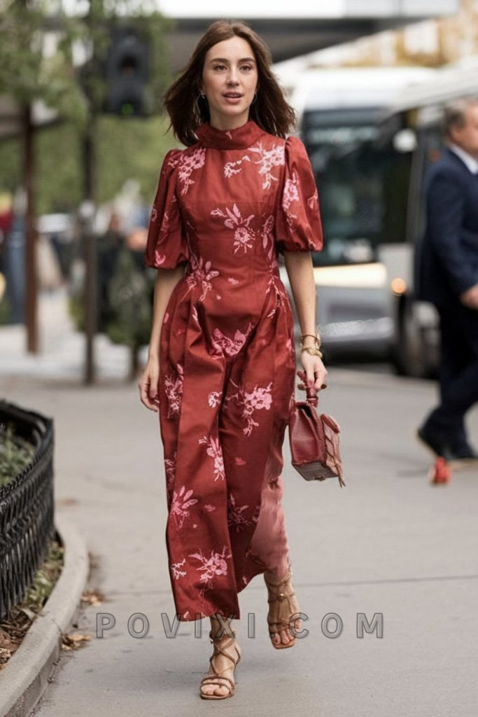 A formal yet feminine choice, this deep red floral maxi dress is both bold and romantic. Featuring elegant lace floral detailing and puffed sleeves, it’s a sophisticated option for evening weddings. The fitted waist and flowing skirt create a flattering silhouette, perfect for curvy women. Paired with strappy sandals and a small clutch, it seamlessly blends classic elegance with a modern twist. Gold accessories and a matching lipstick shade will further enhance the luxurious feel of this outfit.