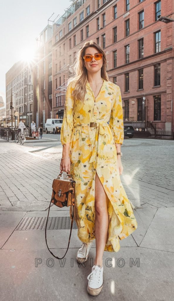 A statement piece for summer, this cheerful yellow maxi dress combines casual charm with classy appeal. Featuring long sleeves and a front slit, it’s a versatile option for daytime or evening weddings. The subtle belt detail enhances the waist, making it a flattering option for different body shapes. Paired with sneakers for an unexpected twist or heels for a polished touch, this outfit radiates sunshine and confidence. A woven handbag and oversized sunglasses complete the effortlessly stylish look.