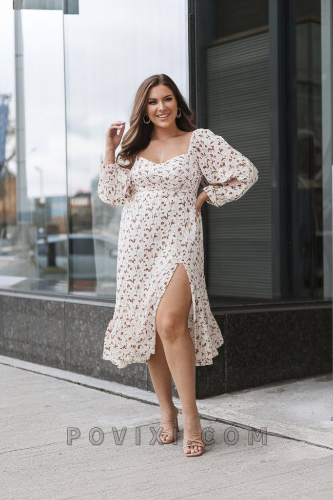 This stunning women formal dress is perfect for both curvy and plus size figures, thanks to its flattering empire waistline. The subtle floral pattern on an ivory base makes it a dreamy choice for weddings in rustic settings. Complete the look with neutral accessories for a refined yet romantic feel. A soft half-up, half-down hairstyle and pearl earrings will further elevate this timeless outfit.
