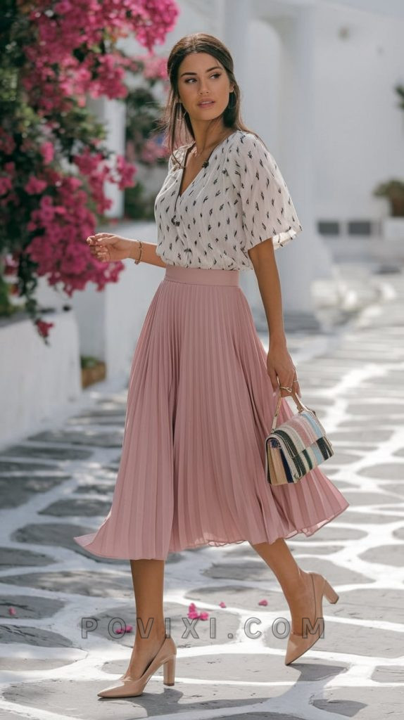 For those who prefer separates, a pleated midi skirt in blush pink paired with a delicate printed blouse is a winning combination. This women classy outfit is ideal for outdoor weddings where comfort meets elegance. Nude block heels and a structured handbag complete the sophisticated ensemble. Opt for soft curls or a sleek ponytail to match the graceful nature of the look.