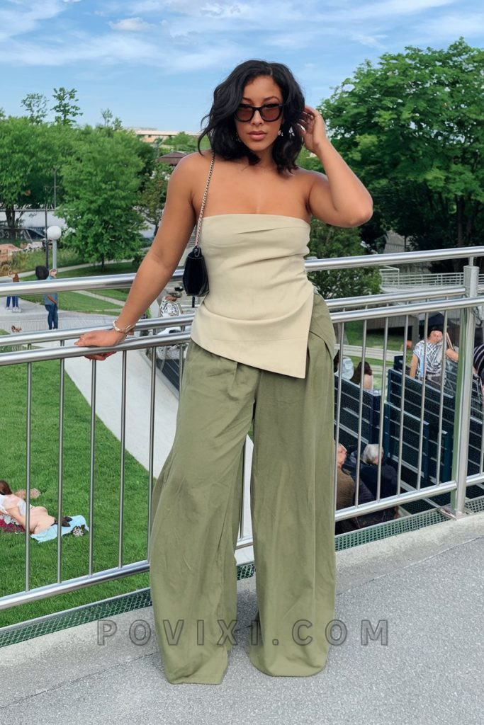 Breaking away from traditional dresses, this stylish pants outfit features a structured linen strapless top paired with wide-leg trousers in a muted olive tone. It’s a classy choice for modern weddings and works beautifully with gold accessories and statement sunglasses for an effortlessly cool aesthetic. Perfect for a contemporary wedding, this outfit is all about confidence and poise.