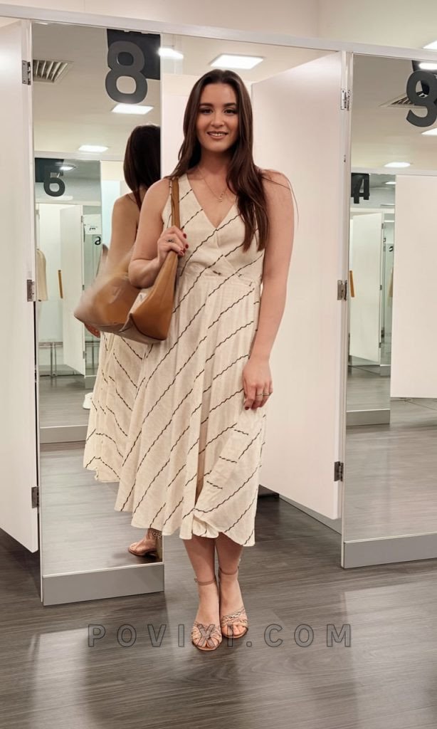 A wrap dress is a universally flattering option for plus size and curvy figures. This cream-colored version with subtle striped detailing enhances the waistline while allowing for comfortable movement. It’s a classy and timeless pick, perfect for everything from garden receptions to vineyard celebrations. Minimalist jewelry and a soft pink lip color make this look effortlessly elegant.