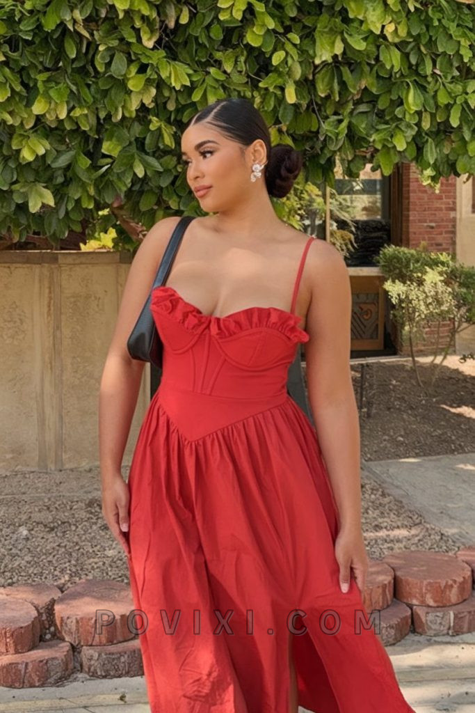 Nothing says confidence and sophistication like a fiery red dress with intricate details. This stunning piece features a structured corset bodice with delicate ruffle accents, offering both support and a flattering silhouette. The flowing skirt, made from breathable fabric, adds an element of ease, making it perfect for outdoor summer weddings. Pair this look with minimal accessories, a sleek bun, and statement earrings to enhance the drama. Opt for neutral-toned heels or metallic sandals for an effortlessly classy finish. Whether you’re attending a garden wedding or a chic rooftop reception, this ensemble guarantees an unforgettable entrance.