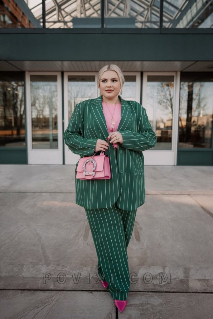 Sophisticated Green Pinstripe Suit with a Pop of Pink