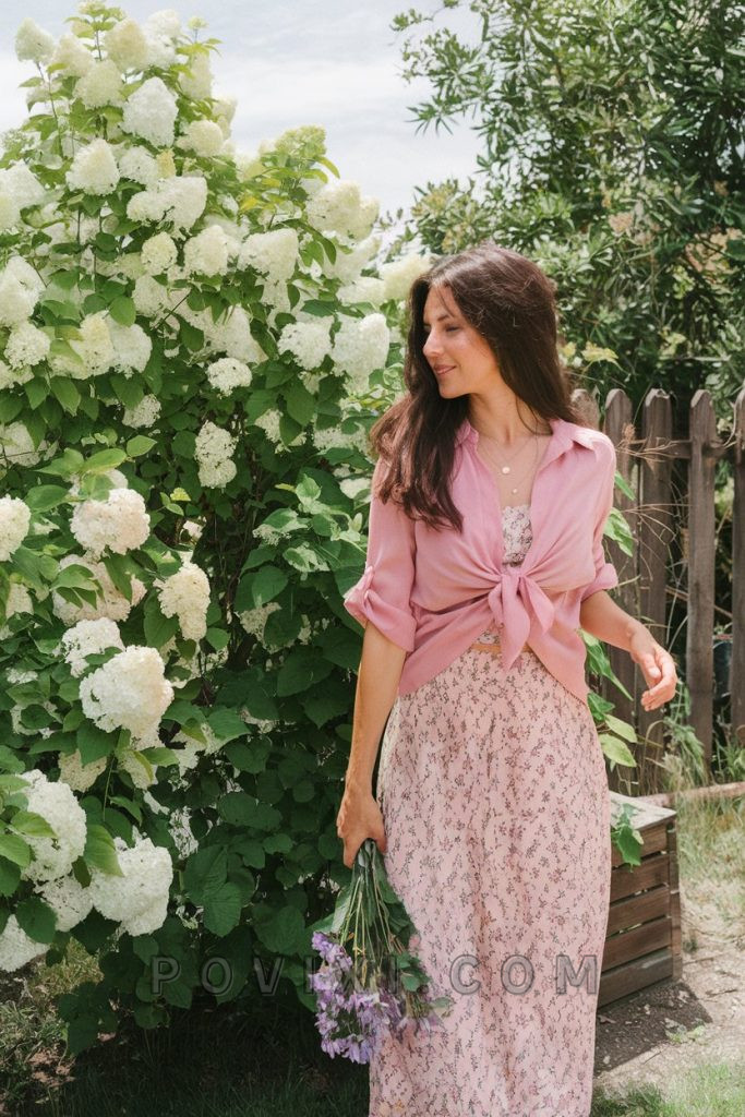 This ensemble perfectly captures the essence of summer with its floral patterned maxi skirt paired with a soft pink blouse. The blouse’s tie-front detail adds a playful touch, while the full-length skirt brings an element of drama and elegance. This outfit is ideal for guests who prefer a casual yet formal look that transitions effortlessly from a sunny afternoon ceremony to an evening reception. Enhance this look with simple gold jewelry and a woven clutch for a touch of rustic charm.