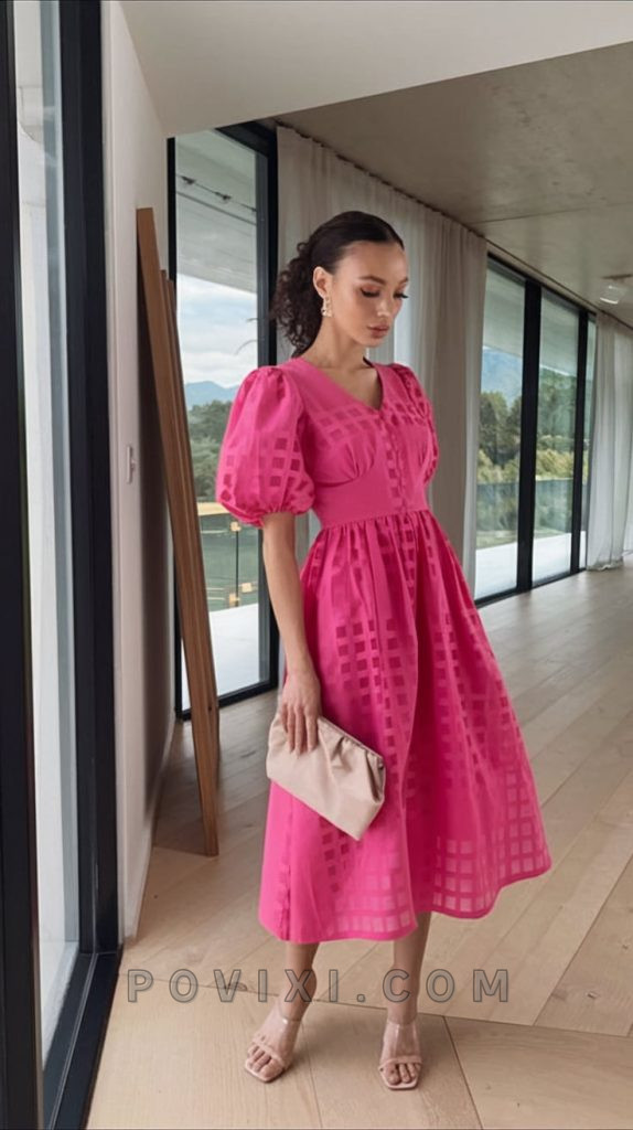 Make a bold statement at the next summer wedding with this vibrant fuchsia dress. The puffed sleeves and square neckline are on-trend, offering a modern take on retro inspirations. The dress’s silk or satin material drapes beautifully, reflecting sophistication and luxury. This piece is a standout choice for an evening event, where its rich color can truly shine under the soft glow of sunset and candlelight.
