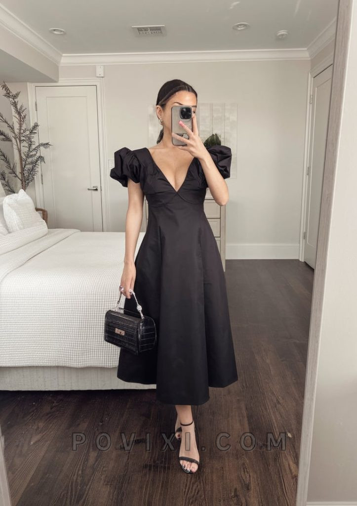 A timeless black midi dress is a staple in any wardrobe, and this one with puff sleeves and a plunging neckline adds a contemporary twist. Ideal for those who value classy and women formal aesthetics, this dress combines comfort with high-end fashion. Its versatile design makes it suitable for both formal ceremonies and relaxed receptions. Pair it with metallic accessories to elevate the look.
