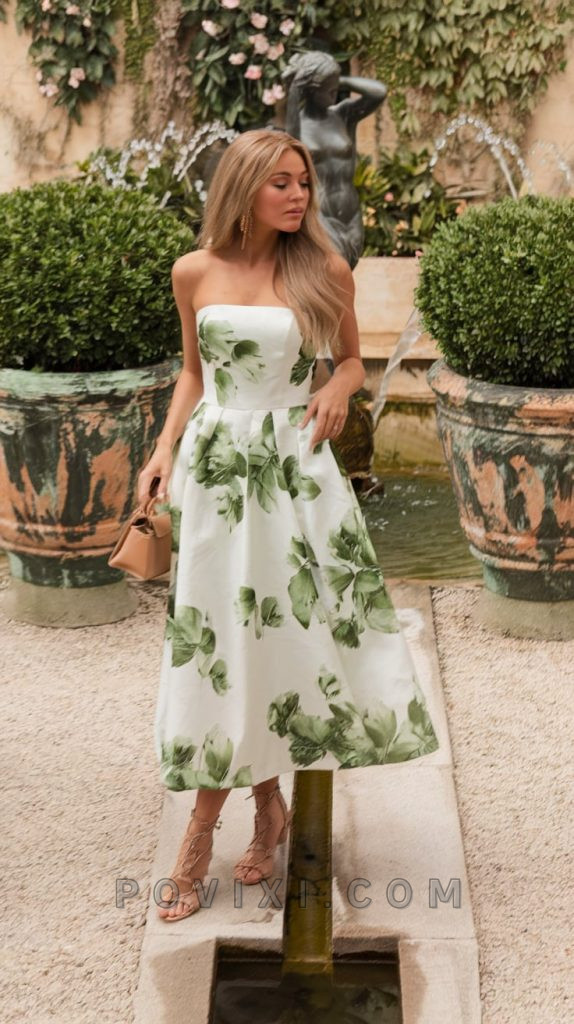 A strapless green dress with a botanical print brings a fresh perspective to summer wedding attire. The dress’s linen or light satin fabric makes it breathable and luxurious, suitable for both casual and formal settings. Its timeless cut and unique print make it a fashionable choice that stands out in a crowd without overshadowing the event’s celebratory nature.