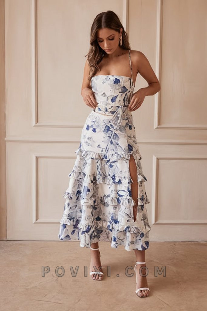 Ruffles add a playful touch to this floral midi dress, which features a tasteful slit for a hint of allure. The light and airy fabric makes it a perfect choice for warm-weather weddings. This look is versatile enough to fit both casual garden parties and more formal celebrations.