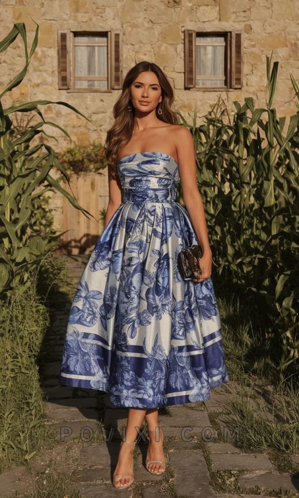 This strapless blue and white dress exudes classic elegance with a modern flair. The print and voluminous skirt draw inspiration from traditional European styles, while the fabric and silhouette keep it contemporary and chic.