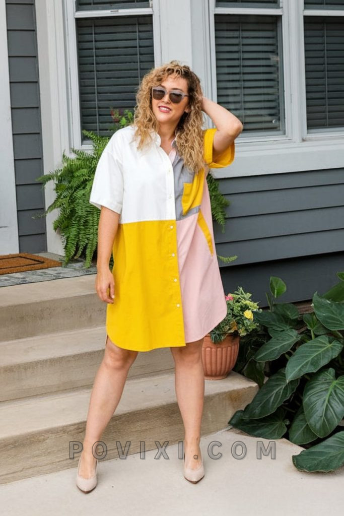 Color blocking remains a dominant trend in 2025, and this short-sleeve button-down dress makes a statement with bold hues of white, yellow, pink, and gray. The relaxed fit ensures comfort while the structured collar adds a touch of refinement. Pair it with nude pumps or white sneakers for a no vip casual-chic look that works from daytime outings to evening socials. Add a woven handbag for a playful touch, or elevate the look with gold jewelry for an effortless transition to an evening dinner date. The unique color combination makes it a versatile choice for fashion-forward women who love a blend of elegance and fun.