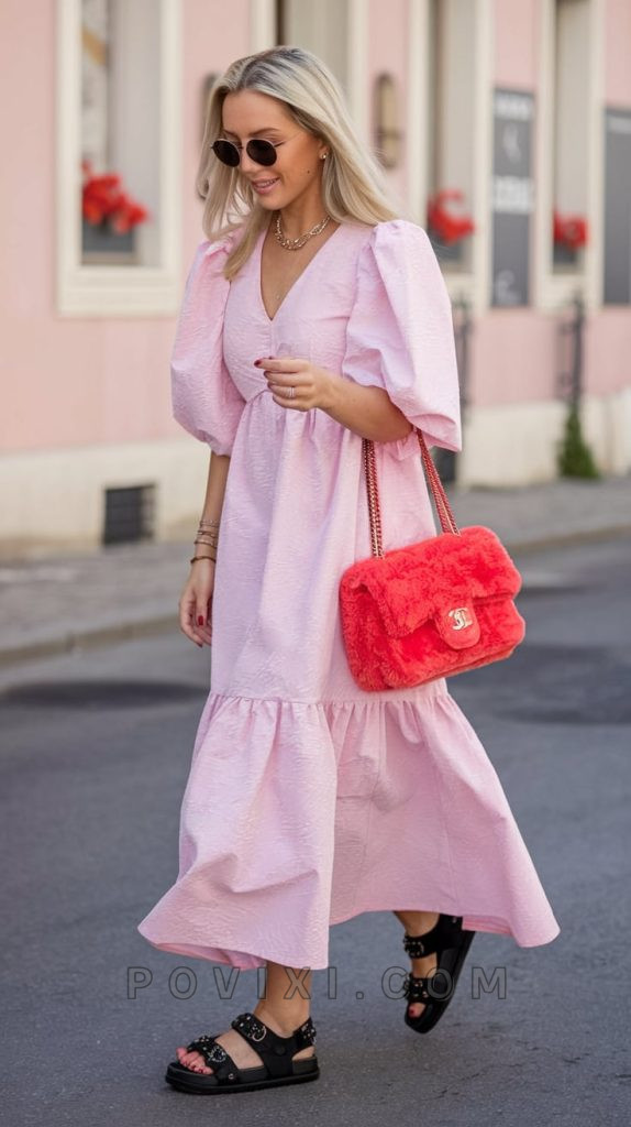 Soft hues dominate outfit ideas this season, and this pastel pink midi dress is a must-have for those who love a romantic aesthetic. With voluminous sleeves and a relaxed fit, this look is perfect for warm afternoons. The pop of red from the plush Chanel bag adds contrast, making this a standout outfit non vip look for brunches and summer evening events.