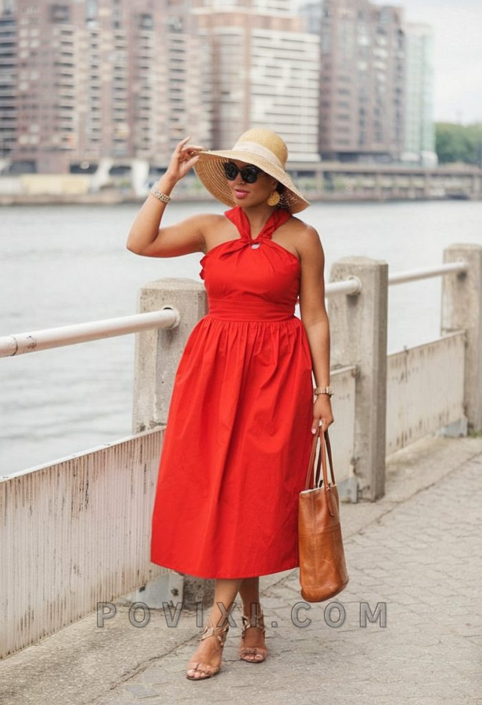 If you want to turn heads, this fiery red midi dress is your answer. With a halter neckline and cinched waist, this look flatters every figure while keeping it classy and sophisticated. Pair it with a wide-brimmed hat and gold accessories for the ultimate vip summer ensemble.