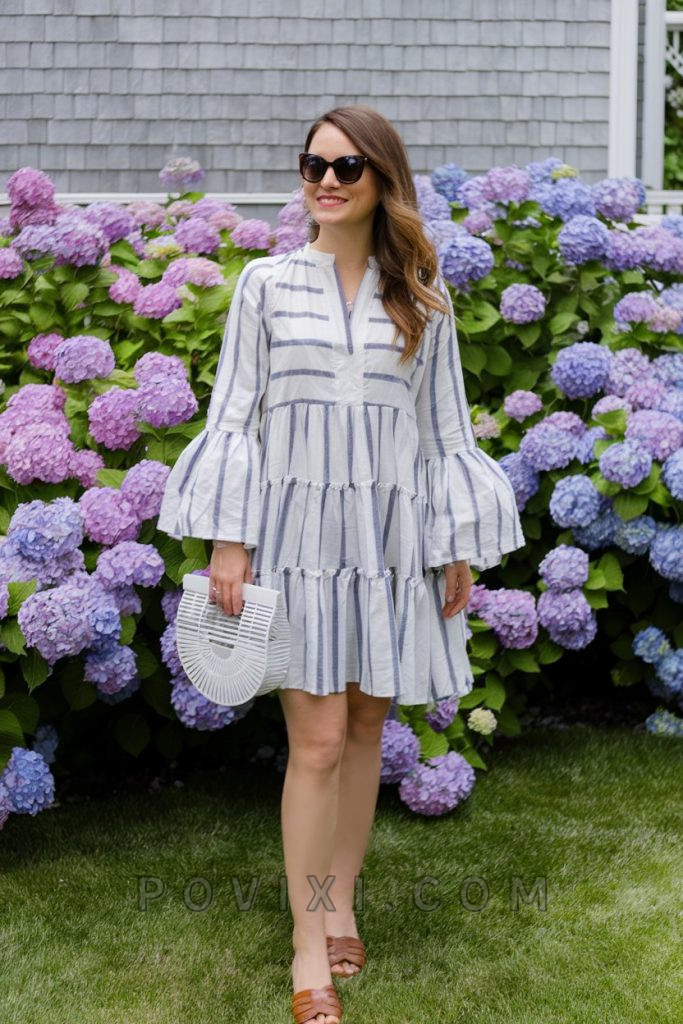 Stripes and summer go hand in hand, and this tiered, flared sleeve dress is a fresh take on nautical fashion. The flowy silhouette makes it perfect for breezy summer days, while the structured handbag adds a contemporary twist. Whether you’re heading for a weekend getaway or a no vip outfits styled brunch, this look has you covered.