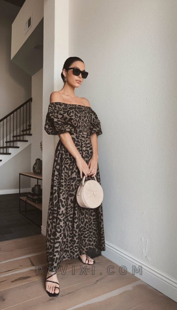 Animal prints have always been a summer staple, and this off-shoulder outfit takes it to the next level. The voluminous puff sleeves balance the fitted waist, creating a silhouette that is both flattering and fierce. Perfect for a camp vacation or an upscale brunch, this dress pairs beautifully with strappy heels and statement earrings. Add oversized sunglasses for a touch of old-Hollywood glamour. If you’re looking to experiment with outfit ideas that exude confidence, this is a go-to summer staple.