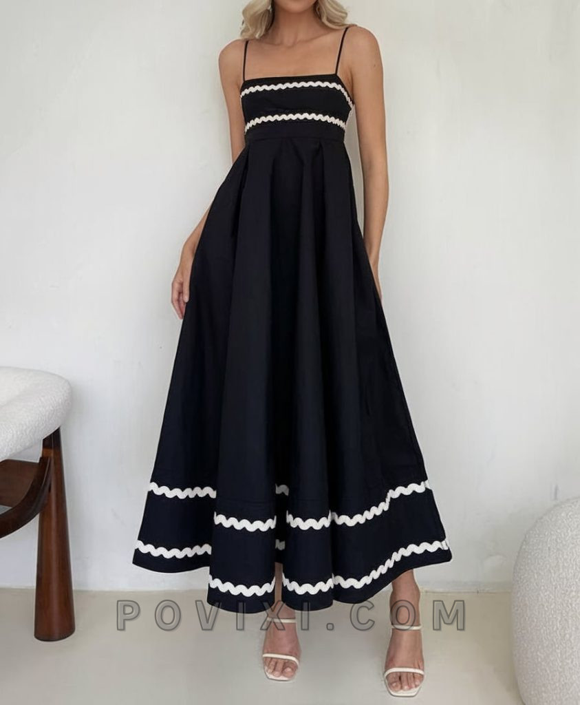 Black and white always make a powerful fashion statement, and this A-line midi dress with contrast trim is a prime example. With its fitted bodice and structured skirt, this dress is perfect for a vip event or an elegant dinner. White strappy heels and delicate jewelry add a polished finish, proving that monochrome can be just as summer-friendly as pastels.