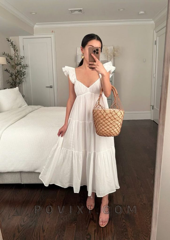 A crisp white dress is the epitome of effortless summer elegance. The ruffled sleeves and tiered structure give this piece a romantic and brat aesthetic, making it perfect for a holiday in the countryside or a casual Sunday brunch. Pair it with nude strappy sandals and a woven bag for a chic yet relaxed look. Add gold jewelry to elevate the ensemble while keeping it minimalistic. This is one of those ideas no vip fashionistas will adore!